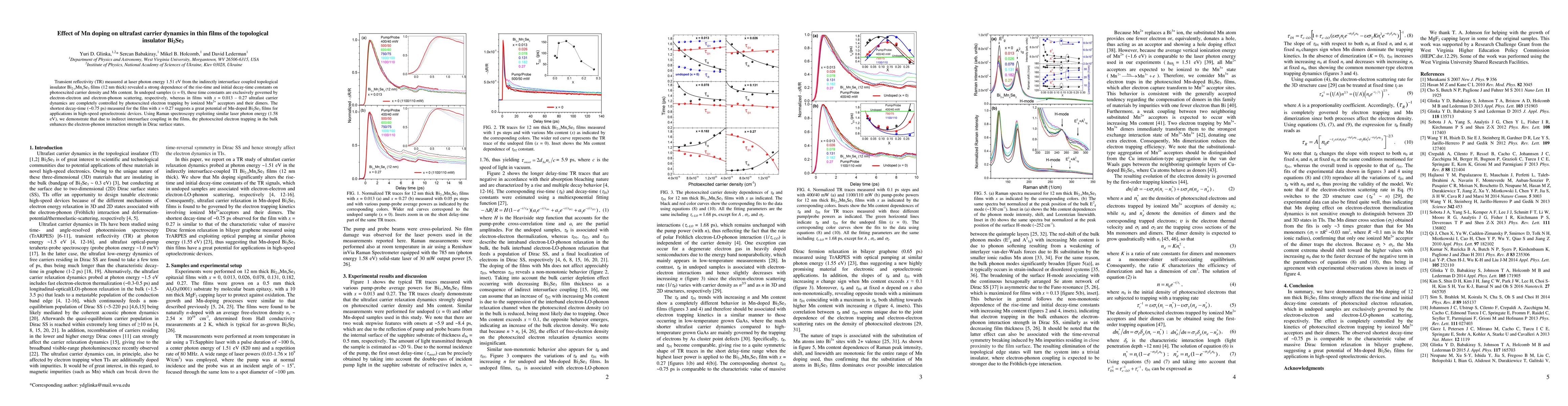 Summary: Mn doping in Bi2Se3 thin films significantly alters ultrafast carrier dynamics, shifting control from electron-electron and electron-phonon scattering to electron trapping by ionized Mn2+ acceptors. The fastest decay time (~0.75 ps) in Mn-doped films indicates their potential for high-speed optoelectronic applications.