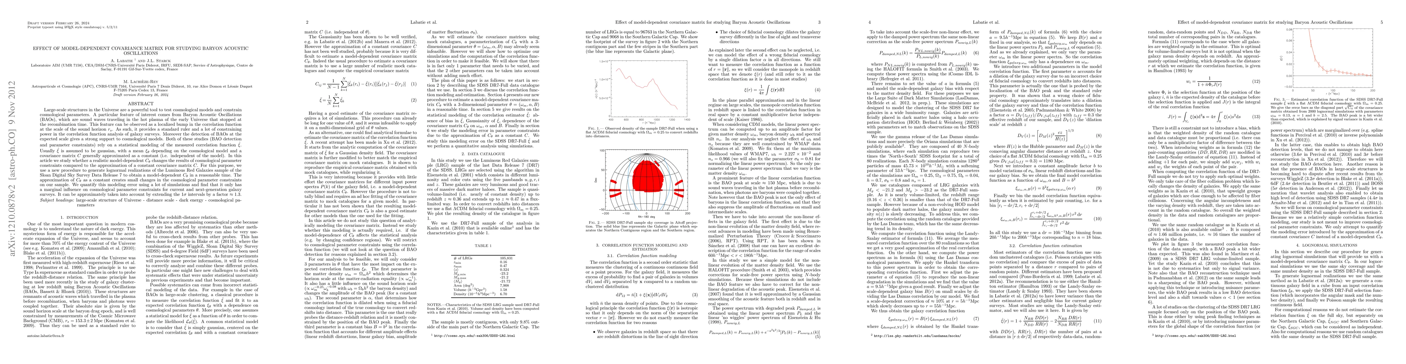 Large-scale structures in the Universe are a powerful tool to test cosmological models and constrain cosmological parameters. A particular feature of interest comes from Baryon Acoustic Oscillations (BAOs), which are sound waves traveling in the hot plasma of the early Universe that stopped at the recombination time. This feature can be observed as a localized bump in the correlation function at the scale of the sound horizon $r_s$. As such, it provides a standard ruler and a lot of constraining power in the correlation function analysis of galaxy surveys. Moreover the detection of BAOs at the expected scale gives a strong support to cosmological models. Both of these studies (BAO detection and parameter constraints) rely on a statistical modeling of the measured correlation function $\hat{\xi}$. Usually $\hat{\xi}$ is assumed to be gaussian, with a mean $\xi_\theta$ depending on the cosmological model and a covariance matrix $C$ generally approximated as a constant (i.e. independent of the model). In this article we study whether a realistic model-dependent $C_\theta$ changes the results of cosmological parameter constraints compared to the approximation of a constant covariance matrix $C$. For this purpose, we use a new procedure to generate lognormal realizations of the Luminous Red Galaxies sample of the Sloan Digital Sky Survey Data Release 7 to obtain a model-dependent $C_\theta$ in a reasonable time. The approximation of $C_\theta$ as a constant creates small changes in the cosmological parameter constraints on our sample. We quantify this modeling error using a lot of simulations and find that it only has a marginal influence on cosmological parameter constraints for current and next-generation galaxy surveys. It can be approximately taken into account by extending the $1\sigma$ intervals by a factor $\approx 1.3$.