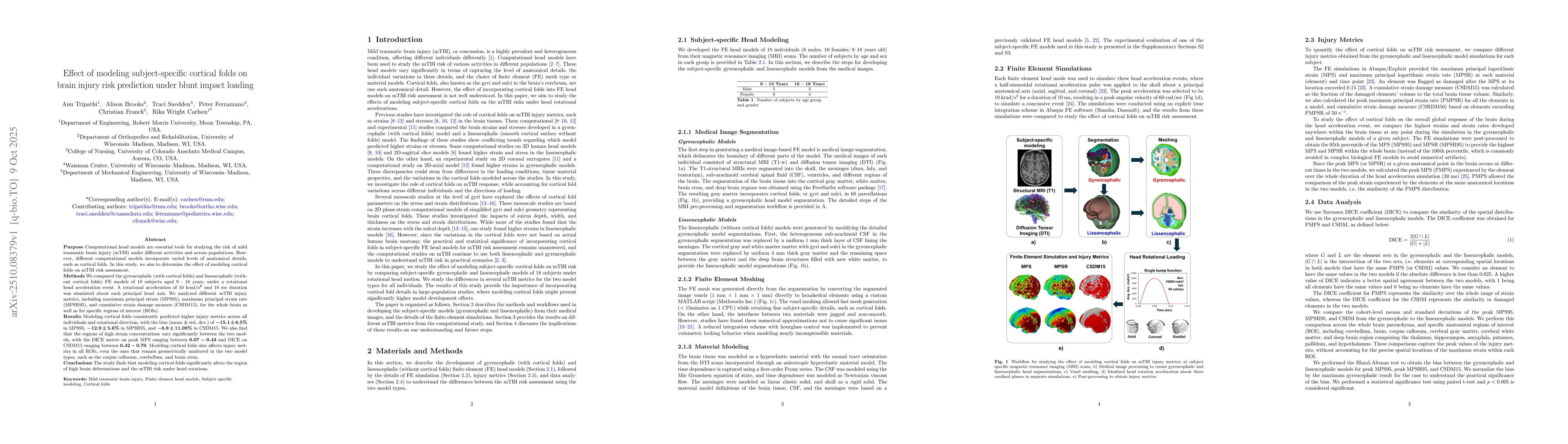 The study employed finite element modeling to simulate brain injury mechanisms, comparing gyrencephalic (with cortical folds) and lissencephalic (smooth brain) models under various loading conditions. Automated segmentation of MRI data was used to create subject-specific models, with manual corrections applied to ensure anatomical accuracy.