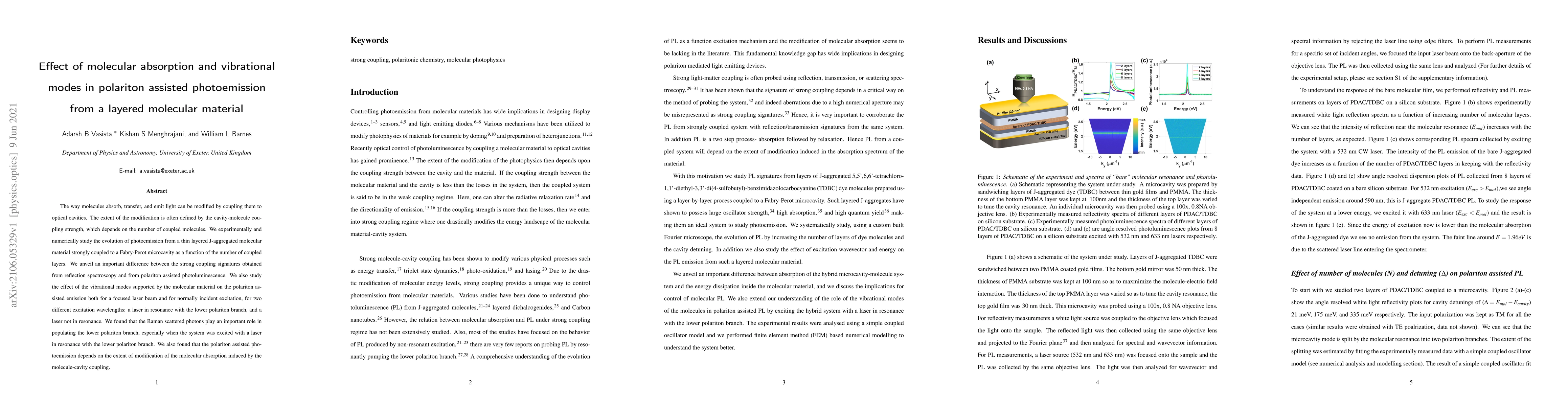 The way molecules absorb, transfer, and emit light can be modified by coupling them to optical cavities. The extent of the modification is often defined by the cavity-molecule coupling strength, which depends on the number of coupled molecules. We experimentally and numerically study the evolution of photoemission from a thin layered J-aggregated molecular material strongly coupled to a Fabry-Perot microcavity as a function of the number of coupled layers. We unveil an important difference between the strong coupling signatures obtained from reflection spectroscopy and from polariton assisted photoluminescence. We also study the effect of the vibrational modes supported by the molecular material on the polariton assisted emission both for a focused laser beam and for normally incident excitation, for two different excitation wavelengths: a laser in resonance with the lower polariton branch, and a laser not in resonance. We found that the Raman scattered photons play an important role in populating the lower polariton branch, especially when the system was excited with a laser in resonance with the lower polariton branch. We also found that the polariton assisted photoemission depends on the extent of modification of the molecular absorption induced by the molecule-cavity coupling.