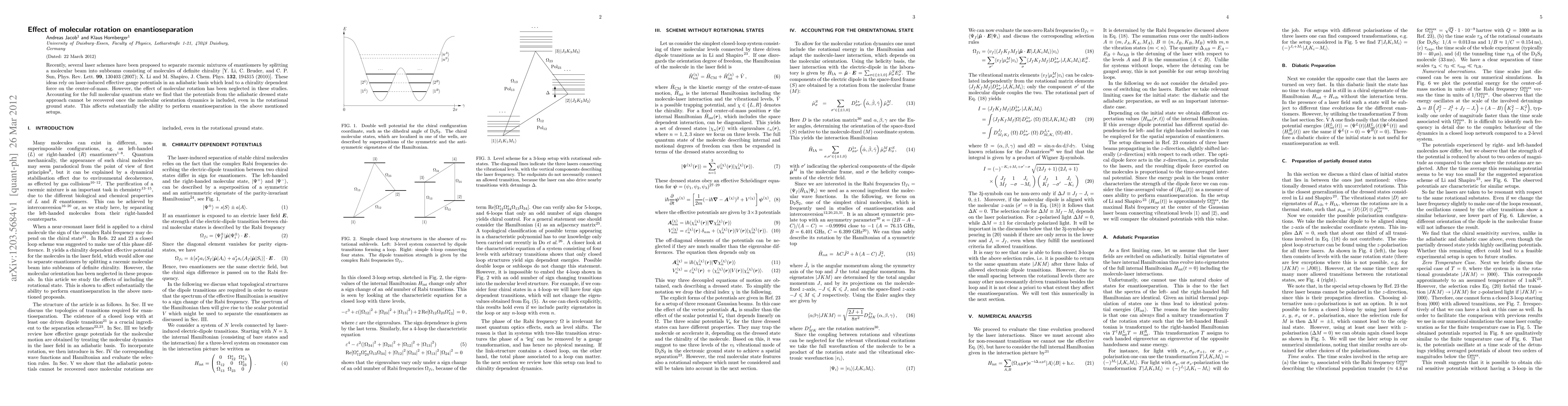 Recently, several laser schemes have been proposed to separate racemic mixtures of enantiomers by splitting a molecular beam into subbeams consisting of molecules of definite chirality [Y. Li, C. Bruder, and C. P. Sun, Phys. Rev. Lett. 99, 130403 (2007); X. Li and M. Shapiro, J. Chem. Phys. 132, 194315 (2010)]. These ideas rely on laser-induced effective gauge potentials in an adiabatic basis which lead to a chirality dependent force on the center-of-mass. However, the effect of molecular rotation has been neglected in these studies. Accounting for the full molecular quantum state we find that the potentials from the adiabatic dressed state approach cannot be recovered once the molecular orientation dynamics is included, even in the rotational ground state. This affects substantially the ability to perform enantioseparation in the above mentioned setups.