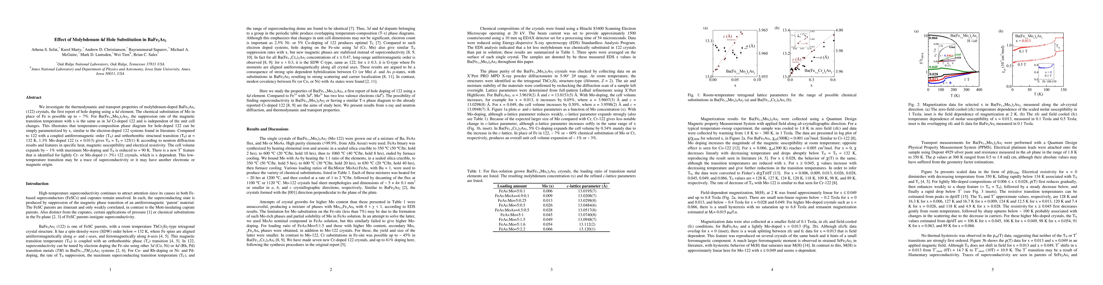We investigate the thermodynamic and transport properties of molybdenum-doped BaFe2As2 (122) crystals, the first report of hole doping using a 4d element. The chemical substitution of Mo in place of Fe is possible up to ~ 7%. For Ba(Fe1-xMox)2As2, the suppression rate of the magnetic transition temperature with x is the same as in 3d Cr-doped 122 and is independent of the unit cell changes. This illustrates that temperature-composition phase diagram for hole-doped 122 can be simply parameterized by x, similar to the electron-doped 122 systems found in literature. Compared to 122 with a coupled antiferromagnetic order (TN) and orthorhombic structural transition (To) at ~ 132 K, 1.3% Mo-doped 122 (x = 0.013) gives TN = To = 125(1) K according to neutron diffraction results and features in specific heat, magnetic susceptibility and electrical resistivity. The cell volume expands by ~ 1% with maximum Mo-doping and TN is reduced to ~ 90 K. There is a new T* feature that is identified for lightly Cr- or Mo-doped (< 3%) 122 crystals, which is x dependent. This low-temperature transition may be a trace of superconductivity or it may have another electronic or magnetic origin.