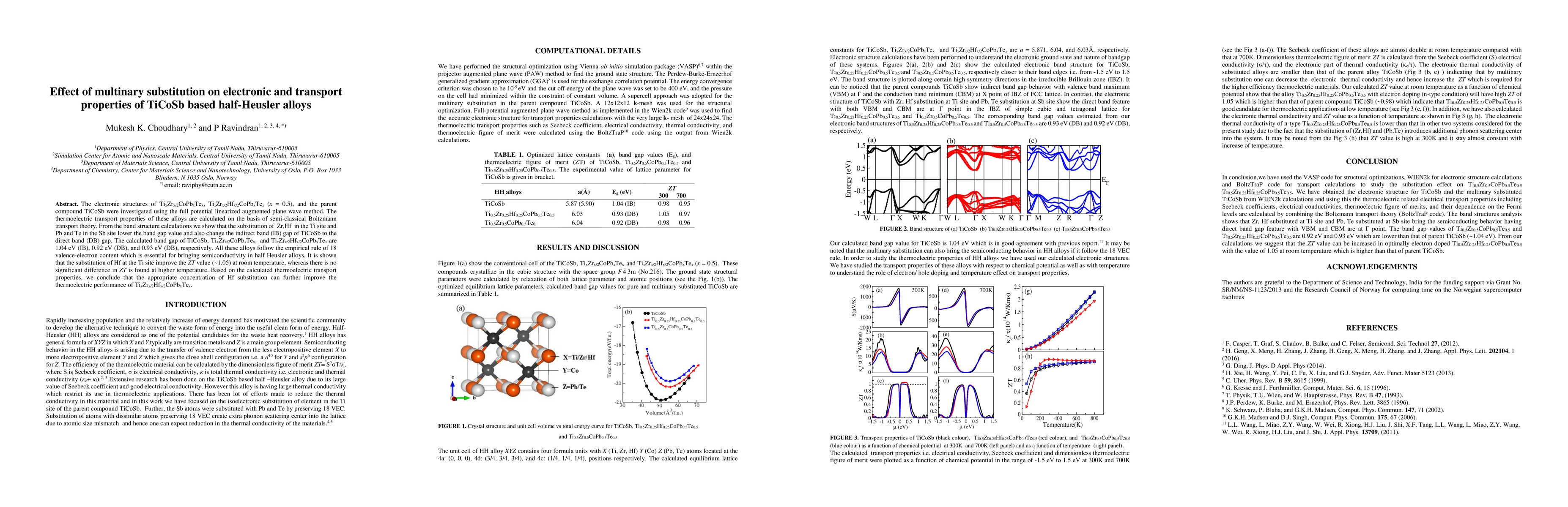 This study investigates the electronic structures and thermoelectric transport properties of TiCoSb-based half-Heusler alloys with multinary substitutions of Zr, Hf, Pb, and Te. The research reveals that these substitutions lower the band gap and transform the band gap from indirect to direct, enhancing thermoelectric performance. Hf substitution notably improves the ZT value at room temperature, suggesting potential for better thermoelectric efficiency.
