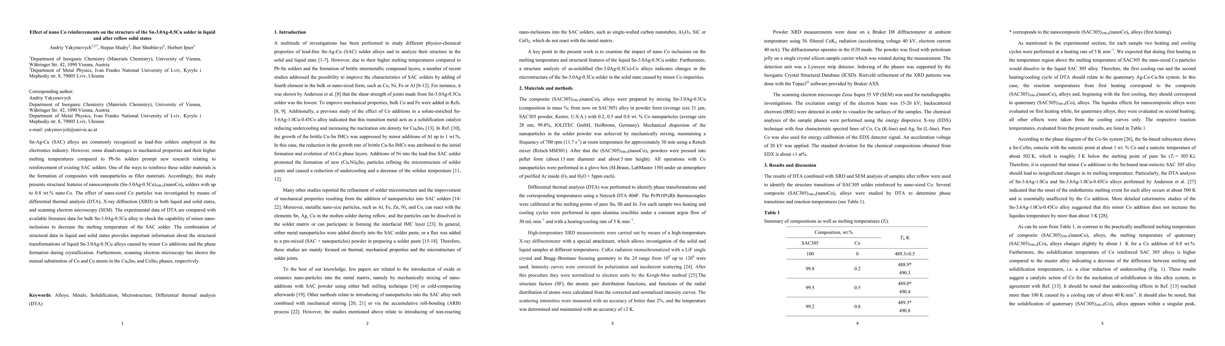 Researchers studied the effect of nano-sized cobalt particles on the structure of Sn-3.0Ag-0.5Cu solder alloys in both liquid and solid states, finding that they can decrease the melting temperature and alter phase formations.