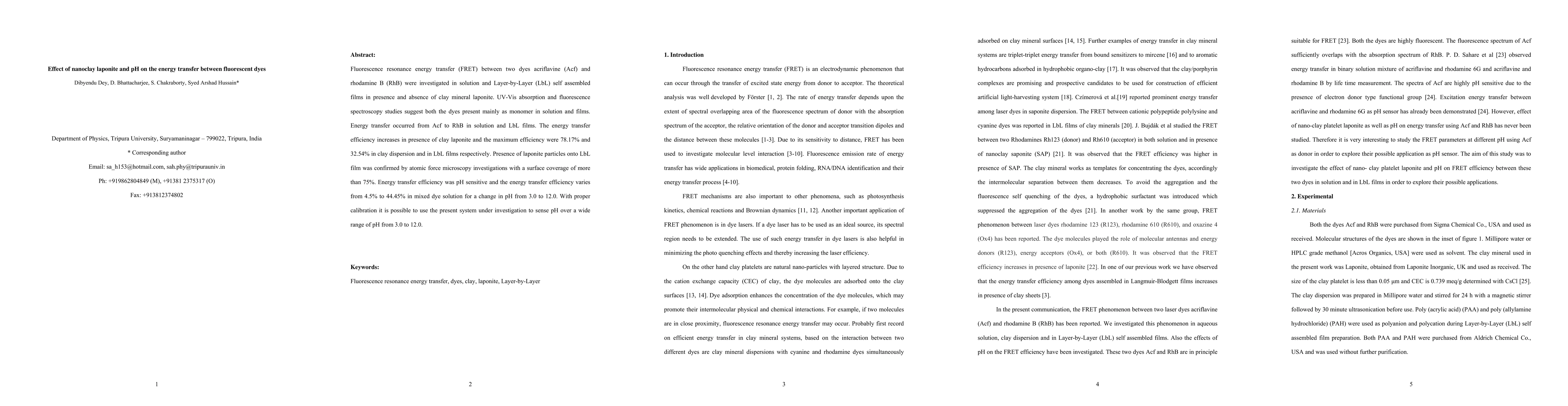 This study investigates the effect of nanoclay laponite and pH on fluorescence resonance energy transfer (FRET) between acriflavine and rhodamine B, finding increased energy transfer efficiency in the presence of laponite. The system shows potential for pH sensing over a wide range from 3.0 to 12.0.
