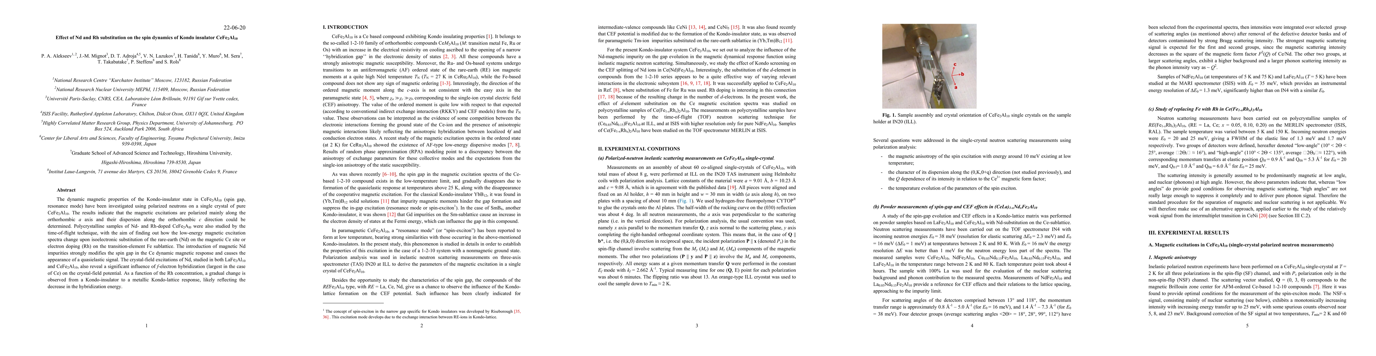 The dynamic magnetic properties of the Kondo-insulator state in CeFe2Al10 (spin gap, resonance mode) have been investigated using polarized neutrons on a single crystal of pure CeFe2Al10. The results indicate that the magnetic excitations are polarized mainly along the orthorhombic a axis and their dispersion along the orthorhombic c direction could be determined. Polycrystalline samples of Nd- and Rh-doped CeFe2Al0 were also studied by the time-of-flight technique, with the aim of finding out how the low-energy magnetic excitation spectra change upon isoelectronic substitution of the rare-earth (Nd) on the magnetic Ce site or electron doping (Rh) on the transition-element Fe sublattice. The introduction of magnetic Nd impurities strongly modifies the spin gap in the Ce dynamic magnetic response and causes the appearance of a quasielastic signal. The crystal-field excitations of Nd, studied in both LaFe2Al10 and CeFe2Al10, also reveal a significant influence of f-electron hybridization (largest in the case of Ce) on the crystal-field potential. As a function of the Rh concentration, a gradual change is observed from a Kondo-insulator to a metallic Kondo-lattice response, likely reflecting the decrease in the hybridization energy.
