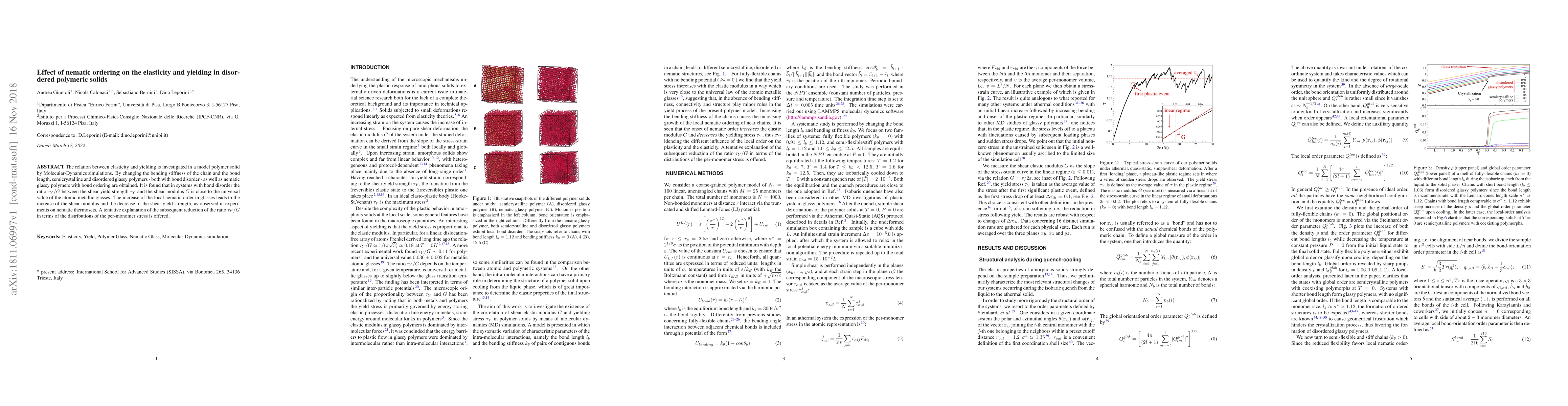 The relation between elasticity and yielding is investigated in a model polymer solid by Molecular-Dynamics simulations. By changing the bending stiffness of the chain and the bond length, semicrystalline and disordered glassy polymers - both with bond disorder - as well as nematic glassy polymers with bond ordering are obtained. It is found that in systems with bond disorder the ratio Ty/G between the shear yield strength Ty and the shear modulus G is close to the universal value of the atomic metallic glasses. The increase of the local nematic order in glasses leads to the increase of the shear modulus and the decrease of the shear yield strength, as observed in experiments on nematic thermosets. A tentative explanation of the subsequent reduction of the ratio Ty/G in terms of the distributions of the per-monomer stress is offered.