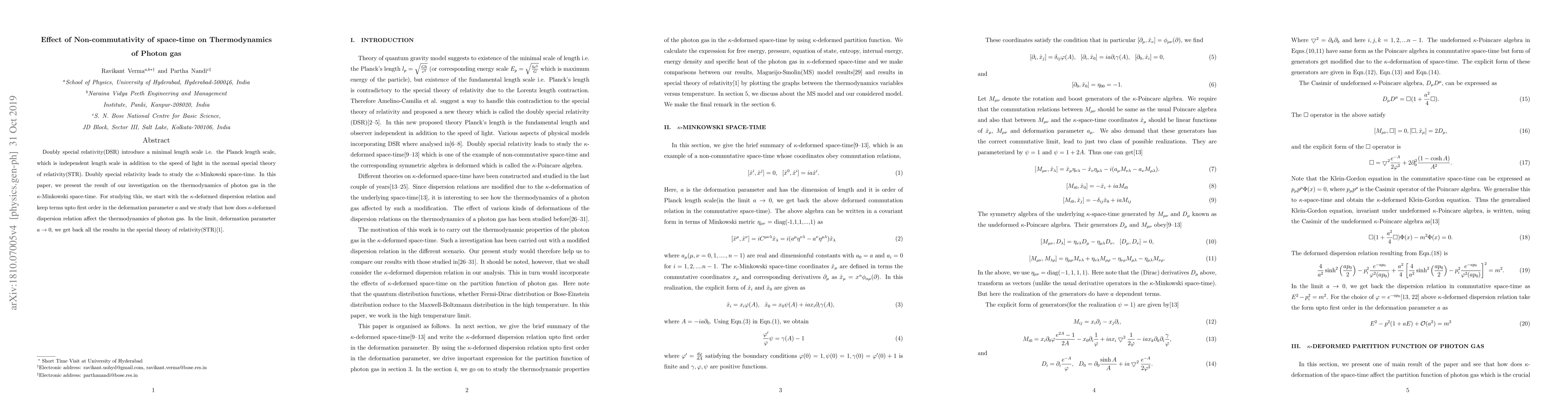 This paper investigates the thermodynamics of photon gas in $\kappa$-Minkowski space-time derived from doubly special relativity, focusing on the $\kappa$-deformed dispersion relation. The study reveals how non-commutativity affects thermodynamic properties, reverting to standard results as the deformation parameter approaches zero.