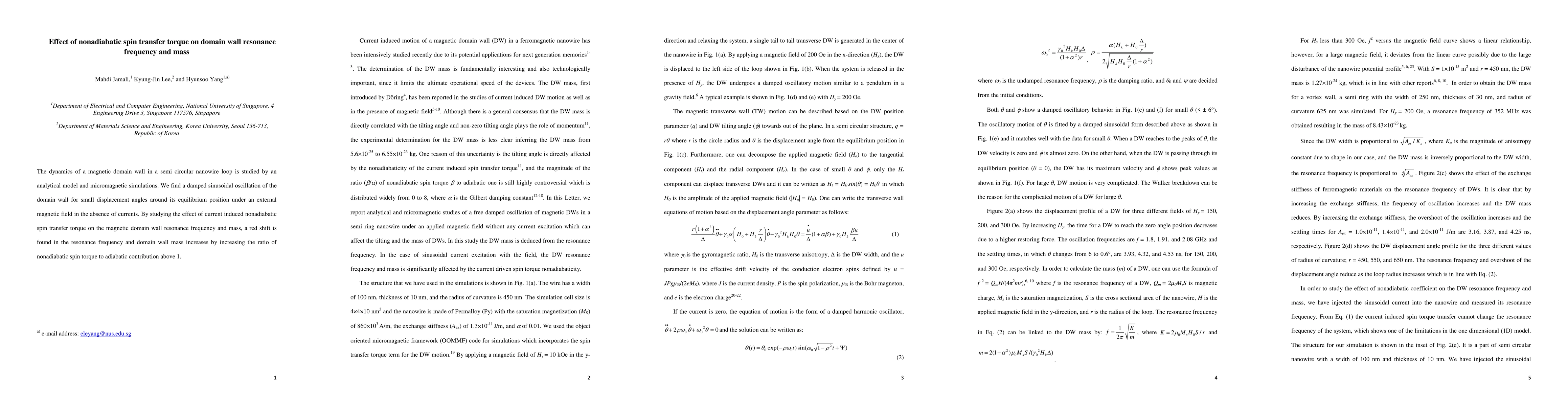 This study investigates the impact of nonadiabatic spin transfer torque on the resonance frequency and mass of a magnetic domain wall in a nanowire loop. Results show a red shift in resonance frequency and increased domain wall mass with a higher ratio of nonadiabatic to adiabatic spin torque.