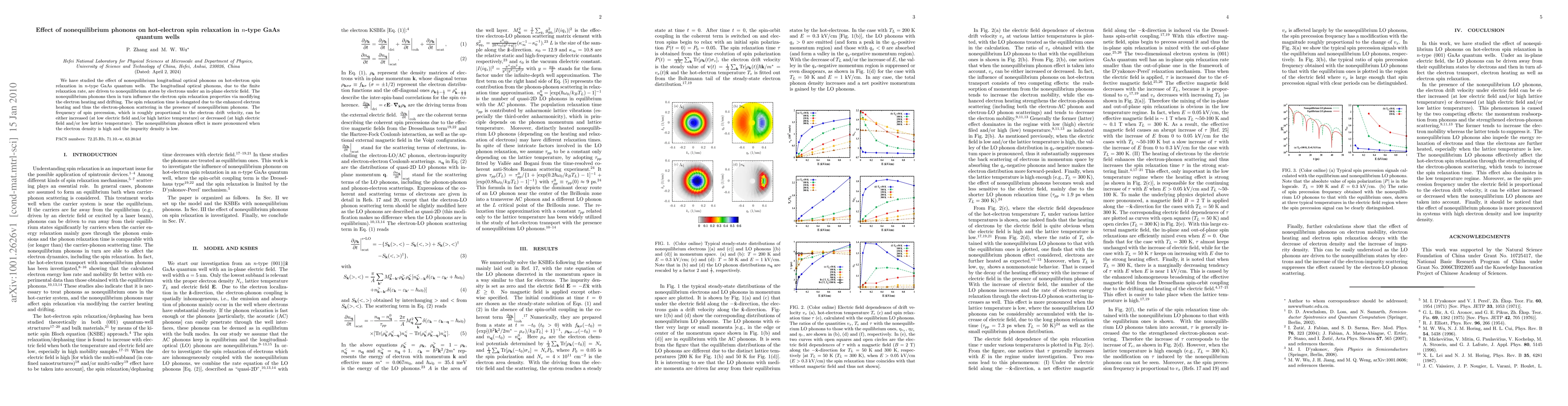 This paper investigates how nonequilibrium longitudinal optical phonons impact hot-electron spin relaxation in n-type GaAs quantum wells, finding that nonequilibrium phonons enhance electron heating and extend spin relaxation time. The frequency of spin precession is affected depending on the electric field and lattice temperature, with stronger effects at higher electron densities and lower impurity densities.