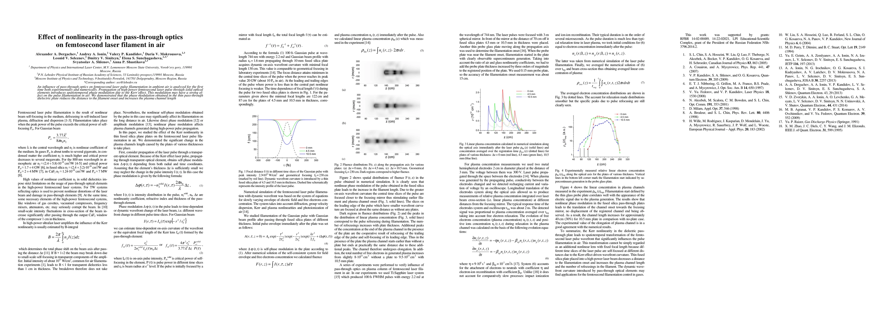 Summary: This study investigates the impact of nonlinear phase modulation from pass-through optics on femtosecond laser filamentation in air, revealing that such modulation reduces filament onset distance and extends plasma channel length both experimentally and numerically.