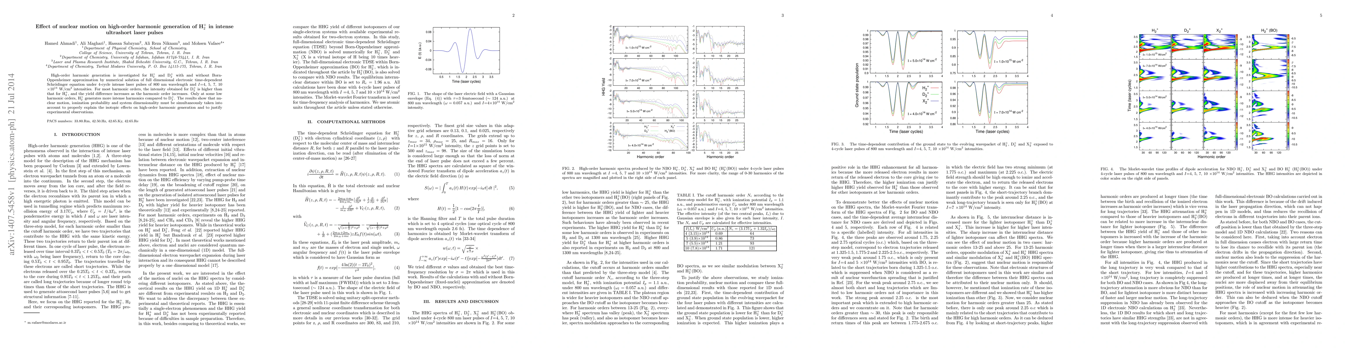 High-order harmonic generation is investigated for H$_2^+$ and D$_2^+$ with and without Born-Oppenheimer approximation by numerical solution of full dimensional electronic time-dependent Schr\"{o}dinger equation under 4-cycle intense laser pulses of 800 nm wavelength and $I$=4, 5, 7, 10 $\times 10^{14}$ W$/$cm$^2$ intensities. For most harmonic orders, the intensity obtained for D$_2^+$ is higher than that for H$_2^+$, and the yield difference increases as the harmonic order increases. Only at some low harmonic orders, H$_2^+$ generates more intense harmonics compared to D$_2^+$. The results show that nuclear motion, ionization probability and system dimensionality must be simultaneously taken into account to properly explain the isotopic effects on high-order harmonic generation and to justify experimental observations.