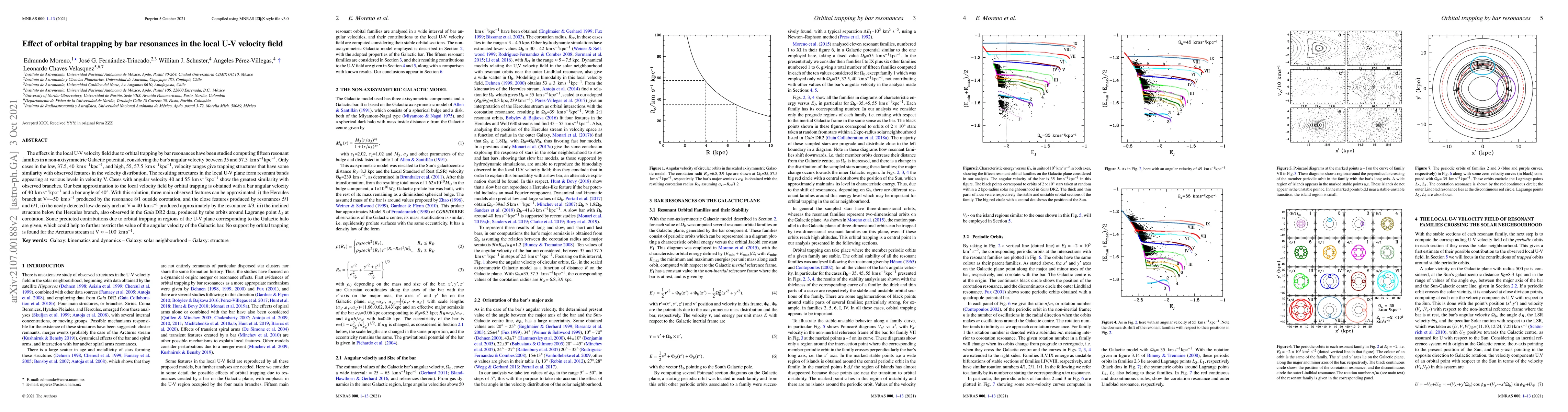 This study investigates the local U-V velocity field's effects due to orbital trapping by bar resonances in a non-axisymmetric Galactic potential, finding that angular velocities of 40 and 55 km s$^{-1}$ kpc$^{-1}$ best match observed features. The best fit, at 40 km s$^{-1}$ kpc$^{-1}$ and a 40$^\circ$ bar angle, approximates three main observed features: the Hercules branch, a low-density arch, and an inclined structure.