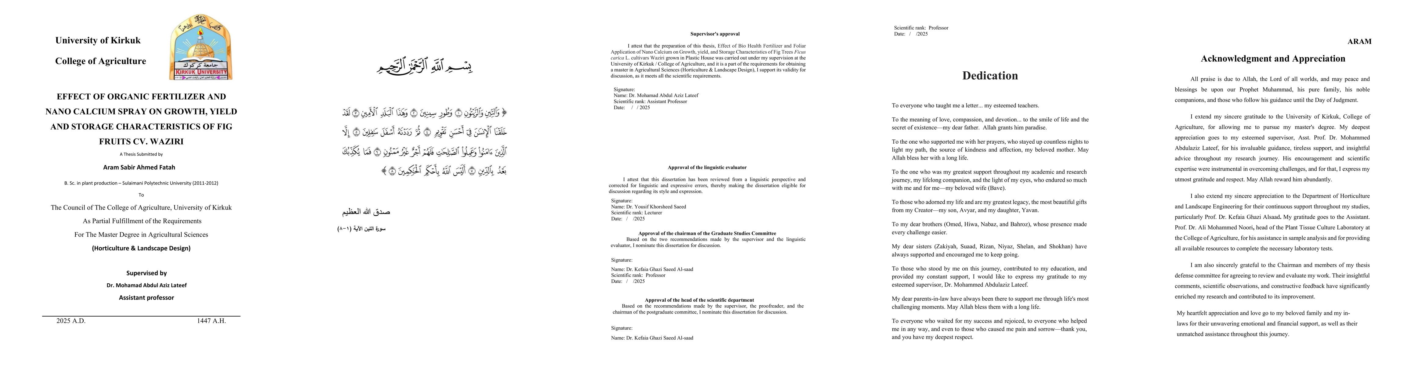 This study was carried out to estimate the effect of organic fertilizer and Nano Calcium spray on the growth, yield, and storage of fig fruits cv. Waziri. It was conducted in the village of Kani Sard in the Sharbazhir district near the Sitak area. This is about 35 km northeast of the center of Sulaymaniyah. This study was conducted at 54 plants with three-year-old fig trees cultivated using the cordon method during the 2024 growth season. The controlled environment of the plastic house enabled a precise evaluation of how different fertilizer treatments affected plant development, fruit traits, and post-storage fruit quality. A randomized complete block design (R.C.B.D.) factorial laid out within two main factors: Bio Health fertilizer applied at three levels (0, 15, and 30 g tree-1) and Nano Calcium applied at three concentrations (0, 75, and 150 mg L-1). The Bio Health fertilizer was applied to the plant in the soil, and Nano Calcium as the foliage with a 16-liter backpack sprayer until completely wet. The fertilizer was supplied in two batches during the growing season, with sprayed in three batches, including the first added (16/4/2024) and the second on (16/5/2024), and the first spraying after a week of fruit holding (25/5/2024). The second spray was after 15 days of the first one, and the third after 15 days of the second spraying. The study reached the following results.