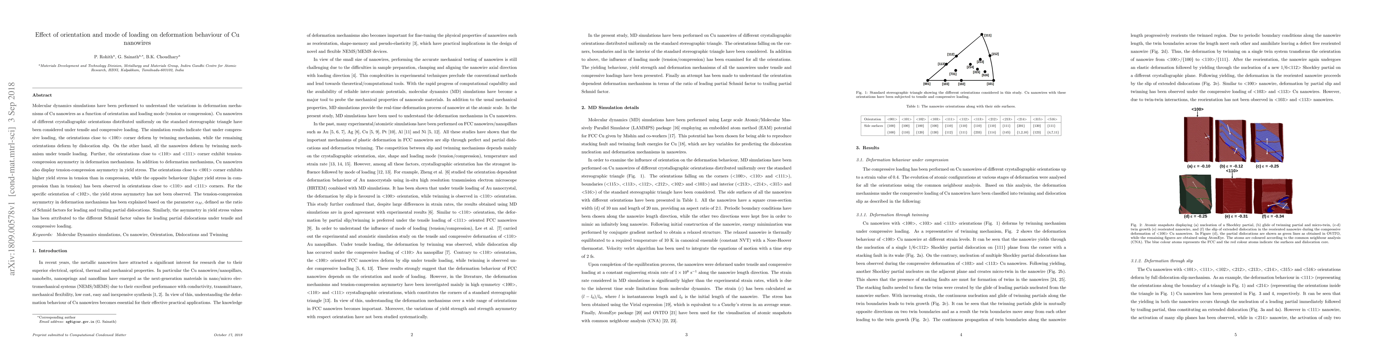 Molecular dynamics simulations reveal that Cu nanowires' deformation mechanisms vary with orientation and loading mode, showing twinning under compression and dislocation slip in other orientations, while tensile loading universally induces twinning. Tension-compression asymmetry in deformation and yield stress is also observed, explained by the Schmid factor ratio.