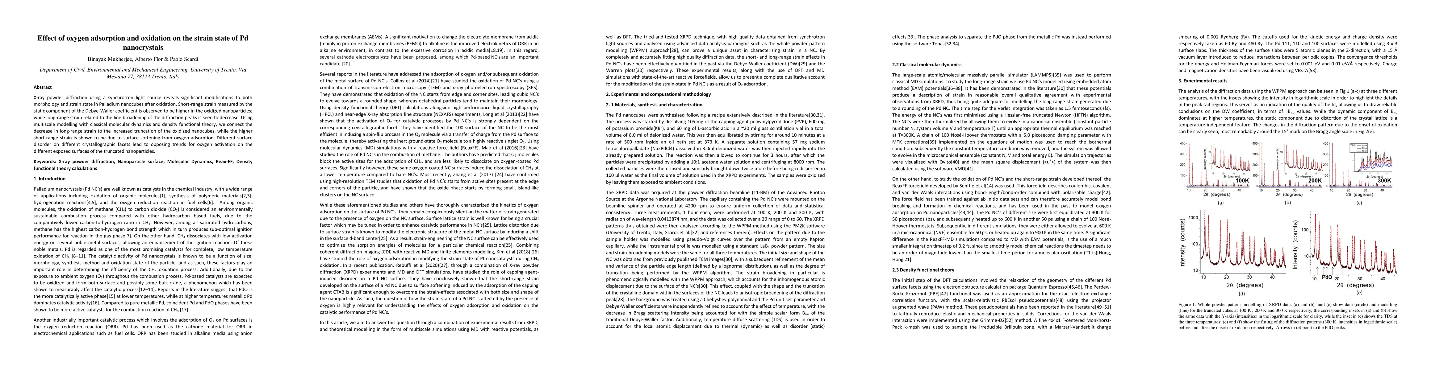 Oxidation of Pd nanocrystals leads to changes in strain state, with short-range strain increasing due to surface softening from oxygen adsorption, while long-range strain decreases as the nanoparticles become truncated.