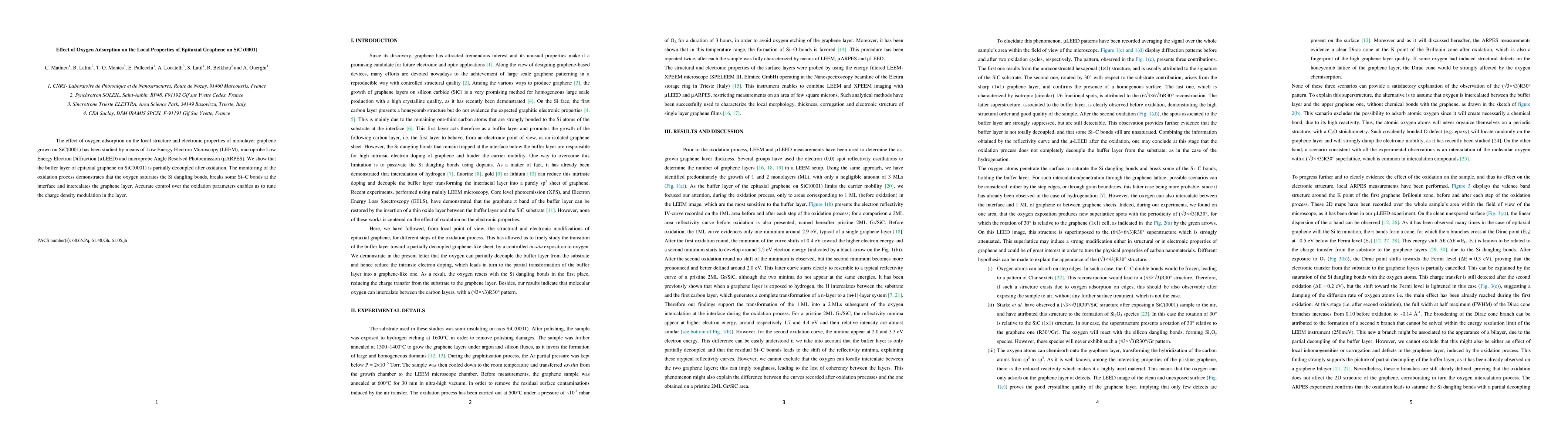 This study investigates how oxygen adsorption alters the local structure and electronic properties of graphene on SiC(0001) using LEEM, μLEED, and μARPES. It reveals that oxidation partially decouples the graphene layer from SiC and modulates charge density through oxygen's interaction with Si dangling bonds and Si-C bonds.