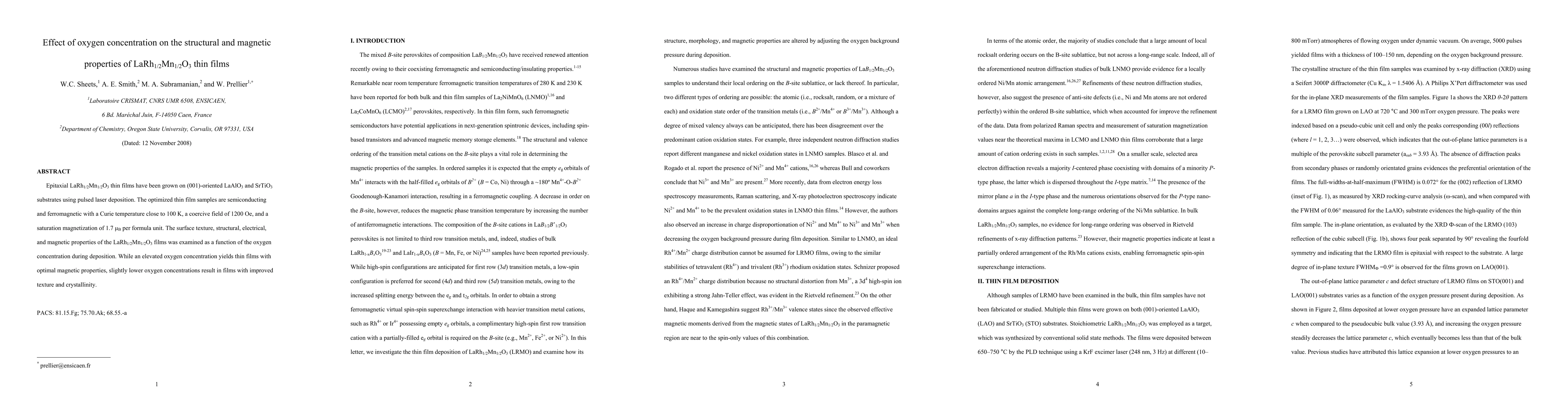 This study investigates LaRh1/2Mn1/2O3 thin films grown on LaAlO3 and SrTiO3 substrates, revealing that elevated oxygen concentration during deposition optimizes magnetic properties, while lower oxygen levels enhance surface texture and crystallinity.