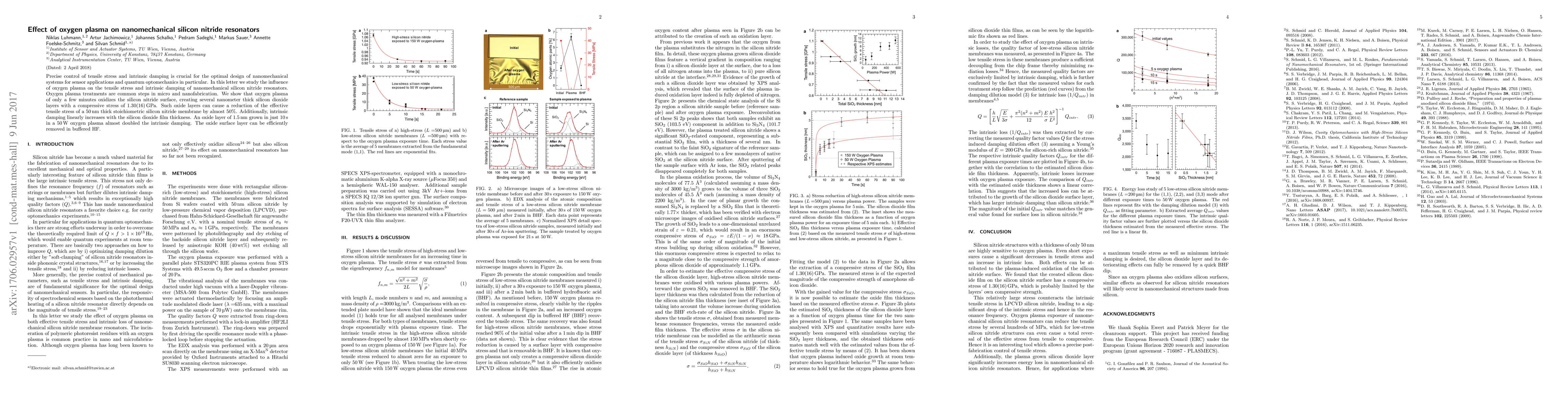 Precise control of tensile stress and intrinsic damping is crucial for the optimal design of nanomechanical systems for sensor applications and quantum optomechanics in particular. In this letter we study the in uence of oxygen plasma on the tensile stress and intrinsic damping of nanomechanical silicon nitride resonators. Oxygen plasma treatments are common steps in micro and nanofabrication. We show that oxygen plasma of only a few minutes oxidizes the silicon nitride surface, creating several nanometer thick silicon dioxide layers with a compressive stress of 1.30(16)GPa. Such oxide layers can cause a reduction of the e ective tensile stress of a 50 nm thick stoichiometric silicon nitride membrane by almost 50%. Additionally, intrinsic damping linearly increases with the silicon dioxide lm thickness. An oxide layer of 1.5nm grown in just 10s in a 50W oxygen plasma almost doubled the intrinsic damping. The oxide surface layer can be e ciently removed in bu ered HF.