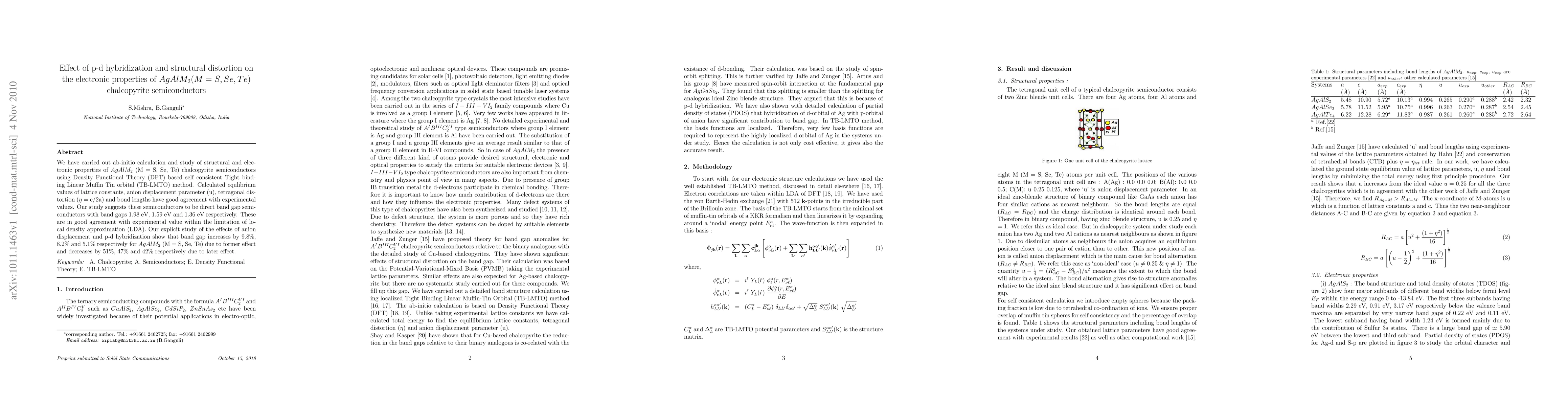We have carried out ab-initio calculation and study of structural and electronic properties of AgAlM2 (M = S, Se, Te) chalcopyrite semiconductors using Density Functional Theory (DFT) based self consistent Tight binding Linear Muffin Tin orbital (TB-LMTO) method. Calculated equlibrium values of lattice constants, anion displacement parameter (u), tetragonal distortion ({\eta} = c/2a) and bond lengths have good agreement with experimental values. Our study suggests these semiconductors to be direct band gap semiconductors with band gaps 1.98 eV, 1.59 eV and 1.36 eV respectively. These are in good agreement with experimental value within the limitation of local density approximation (LDA). Our explicit study of the effects of anion displacement and p-d hybridization show that band gap increases by 9.8%, 8.2% and 5.1% respectively for AgAlM2 (M = S, Se, Te) due to former effect and decreases by 51%, 47% and 42% respectively due to later effect.