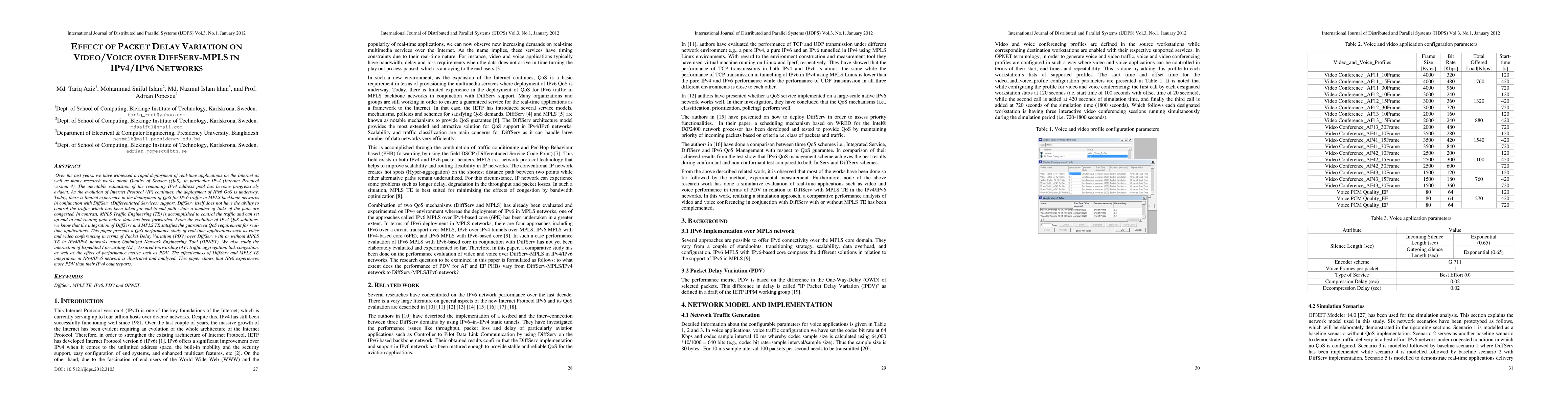 This paper investigates the impact of Packet Delay Variation (PDV) on real-time applications like voice and video over DiffServ-MPLS in IPv4/IPv6 networks. It finds that integrating DiffServ with MPLS Traffic Engineering (TE) improves QoS, but IPv6 traffic experiences higher PDV compared to IPv4.