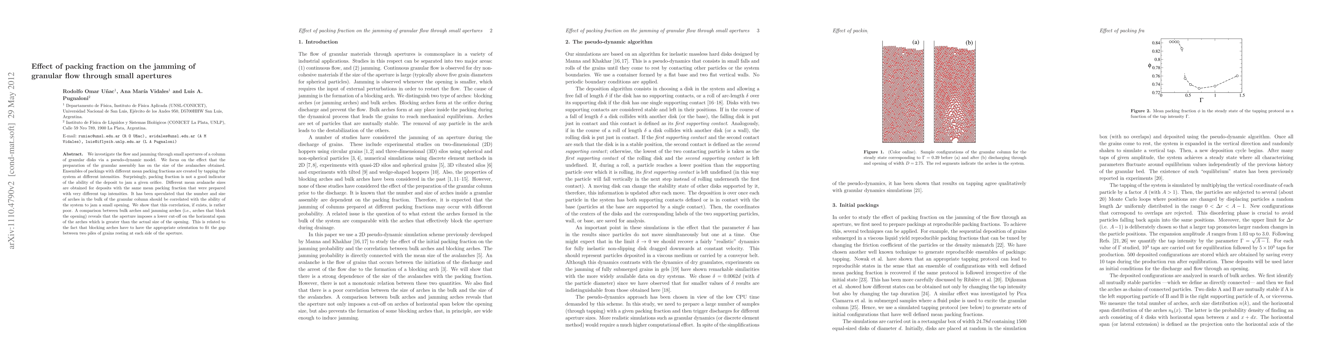 We investigate the flow and jamming through small apertures of a column of granular disks via a pseudo-dynamic model. We focus on the effect that the preparation of the granular assembly has on the size of the avalanches obtained. Ensembles of packings with different mean packing fractions are created by tapping the system at different intensities. Surprisingly, packing fraction is not a good indicator of the ability of the deposit to jam a given orifice. Different mean avalanche sizes are obtained for deposits with the same mean packing fraction that were prepared with very different tap intensities. It has been speculated that the number and size of arches in the bulk of the granular column should be correlated with the ability of the system to jam a small opening. We show that this correlation, if exists, is rather poor. A comparison between bulk arches and jamming arches (i.e., arches that block the opening) reveals that the aperture imposes a lower cut-off on the horizontal span of the arches which is greater than the actual size of the opening. This is related to the fact that blocking arches have to have the appropriate orientation to fit the gap between two piles of grains resting at each side of the aperture.