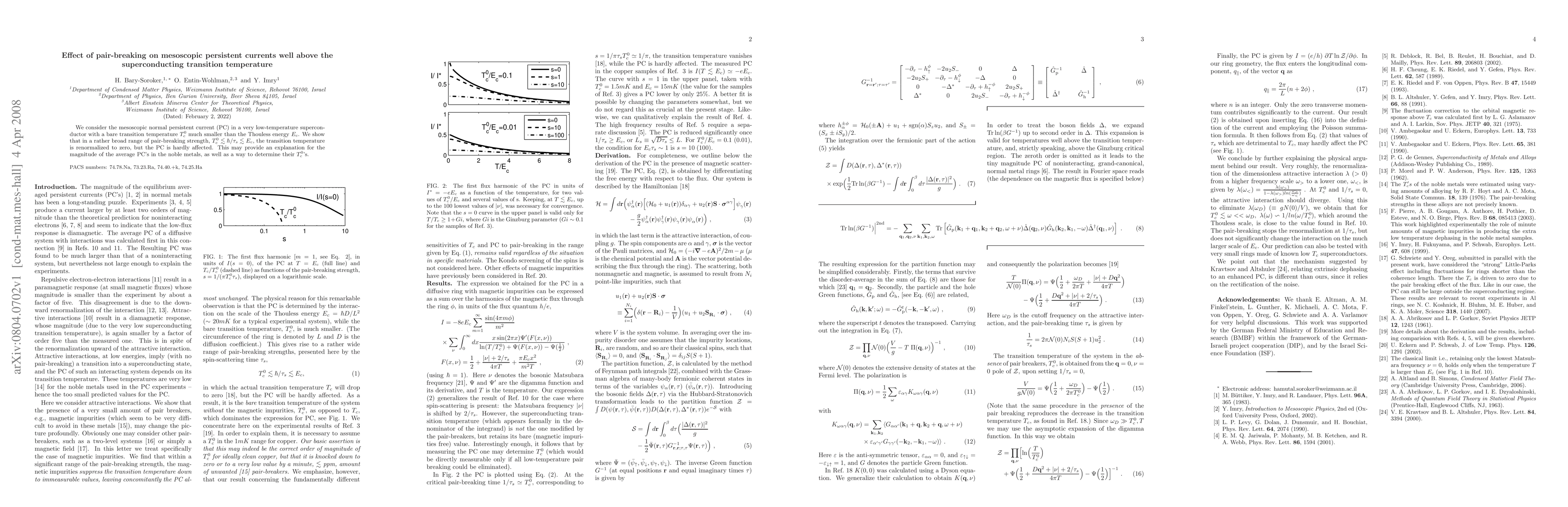 This study investigates how pair-breaking influences mesoscopic persistent currents in low-temperature superconductors, finding that while the transition temperature is renormalized to zero, the persistent currents remain largely unaffected. This insight may help explain the observed persistent currents in noble metals and determine their intrinsic transition temperatures.