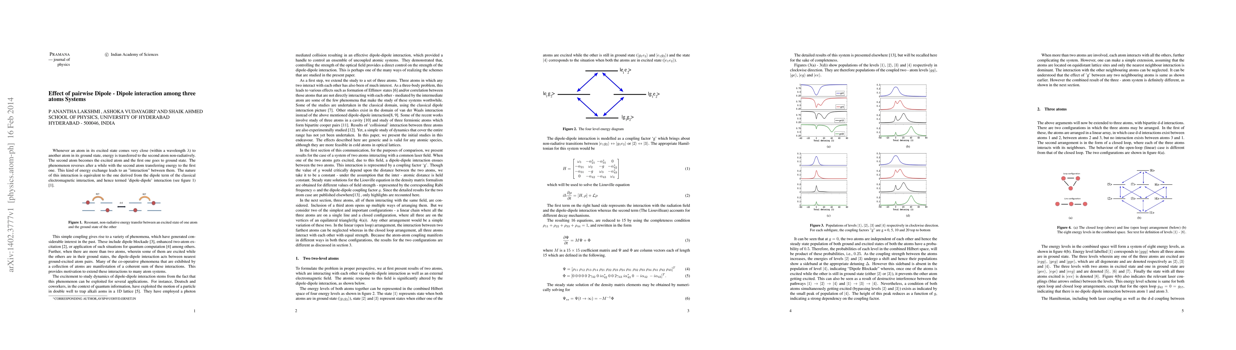 This paper analyzes the dipole-dipole interactions among three two-level atoms, comparing steady-state populations in two configurations: linear and looped arrangements. The third atom significantly alters the system's behavior compared to a two-atom system.