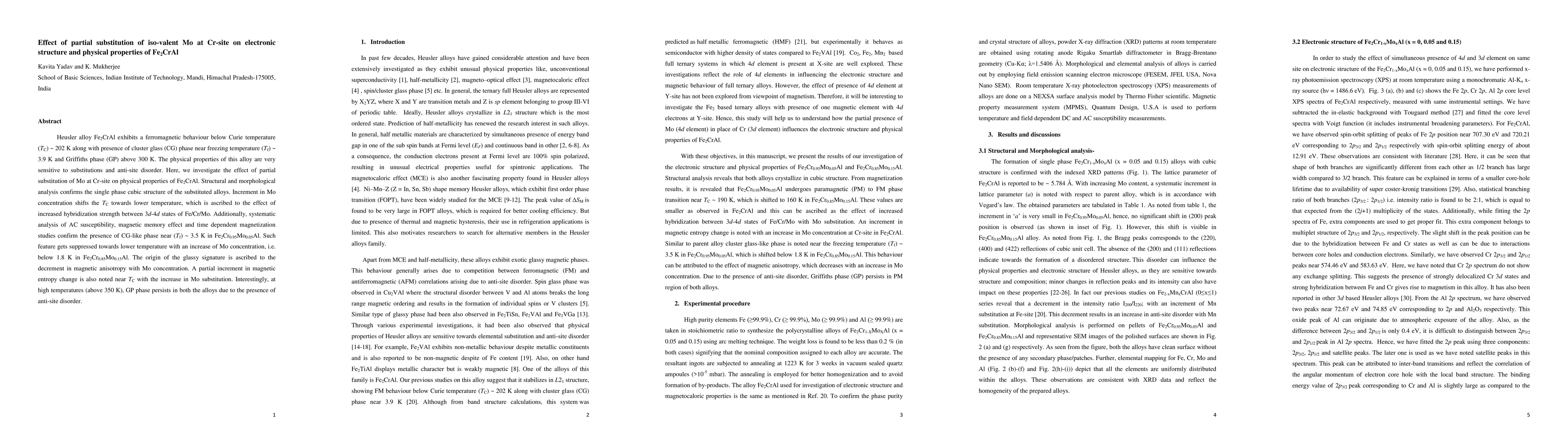 The study investigates the effect of Mo substitution on Fe2CrAl's physical properties, finding that increasing Mo concentration lowers the Curie temperature and suppresses a cluster glass-like phase, while persisting a Griffiths phase at high temperatures.