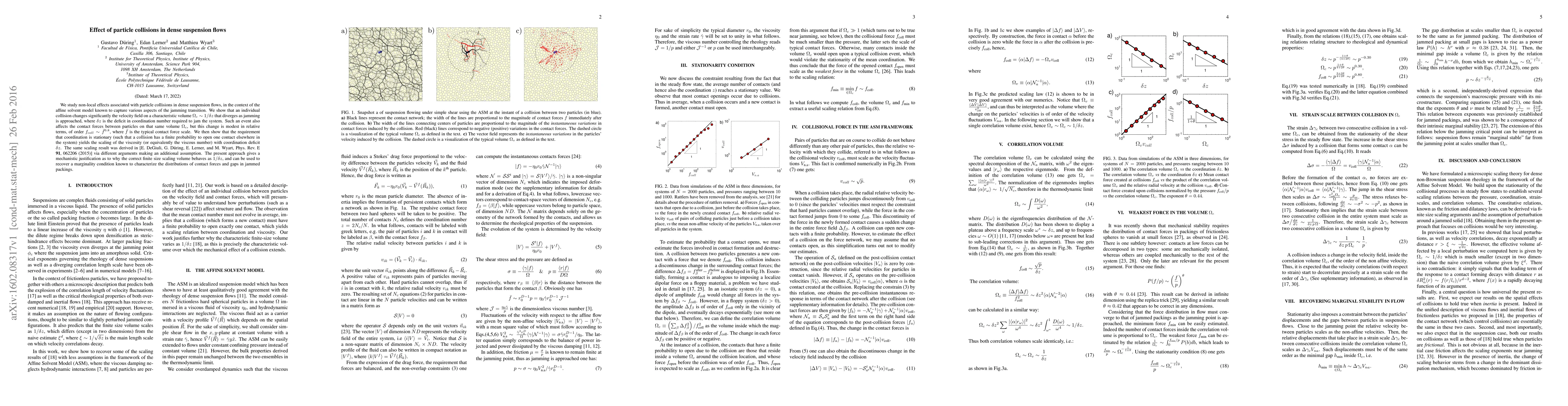 We study non-local effects associated with particle collisions in dense suspension flows, in the context of the affine solvent model known to capture various aspects of the jamming transition. We show that an individual collision changes significantly the velocity field on a characteristic volume $\Omega_c\sim 1/\delta z$ that diverges as jamming is approached, where $\delta z$ is the deficit in coordination number required to jam the system. Such an event also affects the contact forces between particles on that same volume $\Omega_c$, but this change is modest in relative terms, of order $f_{coll}\sim \bar{f}^{0.8}$, where $\bar{f}$ is the typical contact force scale. We then show that the requirement that coordination is stationary (such that a collision has a finite probability to open one contact elsewhere in the system) yields the scaling of the viscosity (or equivalently the viscous number) with coordination deficit $\delta z$. The same scaling result was derived in [E.~DeGiuli, G.~D\"uring, E.~Lerner, and M.~Wyart, Phys.~Rev.~E {\bf 91}, 062206 (2015)] via different arguments making an additional assumption. The present approach gives a mechanistic justification as to why the correct finite size scaling volume behaves as $1/\delta z$, and can be used to recover a marginality condition known to characterize the distributions of contact forces and gaps in jammed packings.
