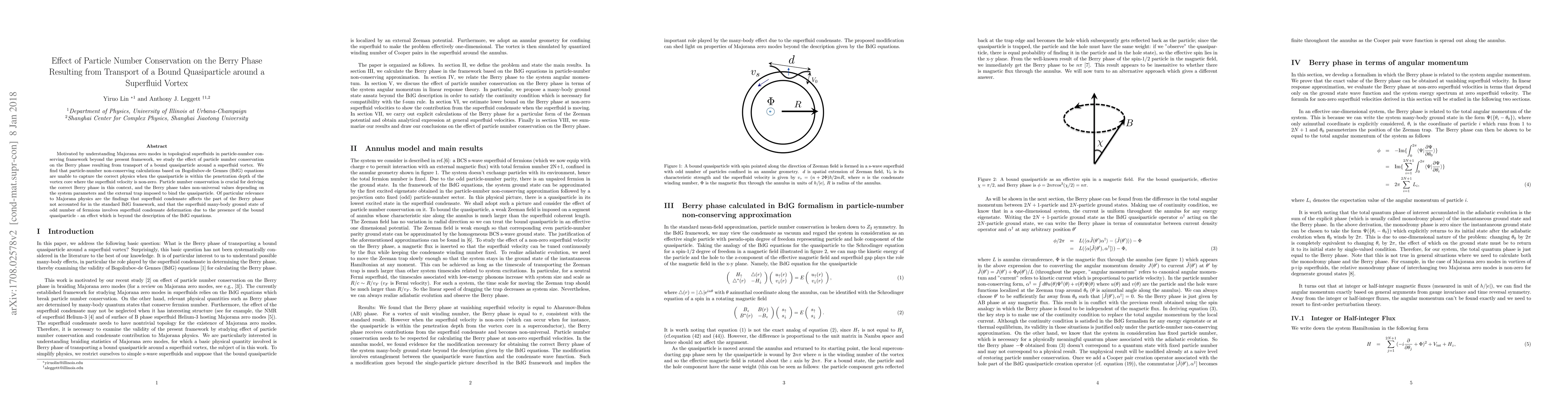 This paper investigates the impact of particle number conservation on the Berry phase of a bound quasiparticle transported around a superfluid vortex, revealing that non-conserving calculations fail to capture correct physics near the vortex core. It emphasizes the importance of conserving particle number for deriving the correct Berry phase, which varies with system parameters and external traps, and highlights the superfluid condensate's influence on Majorana physics beyond the standard BdG framework.