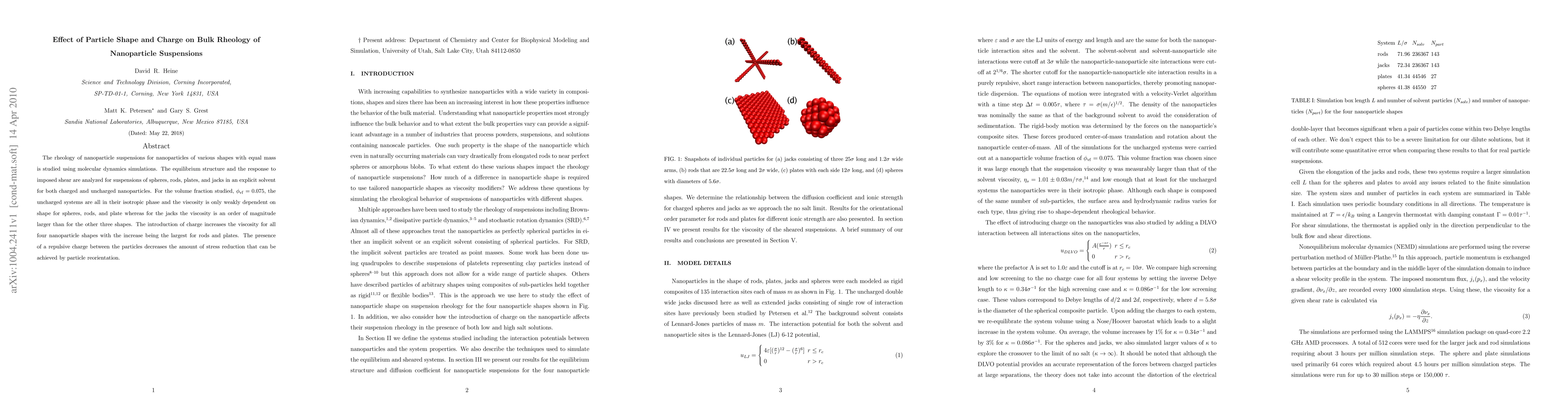 This paper investigates the bulk rheology of nanoparticle suspensions using molecular dynamics simulations, finding that uncharged spheres, rods, and plates exhibit similar viscosities, while jacks show significantly higher viscosity. Charged particles increase viscosity, with rods and plates experiencing the largest increase, and repulsive charges hinder stress reduction.