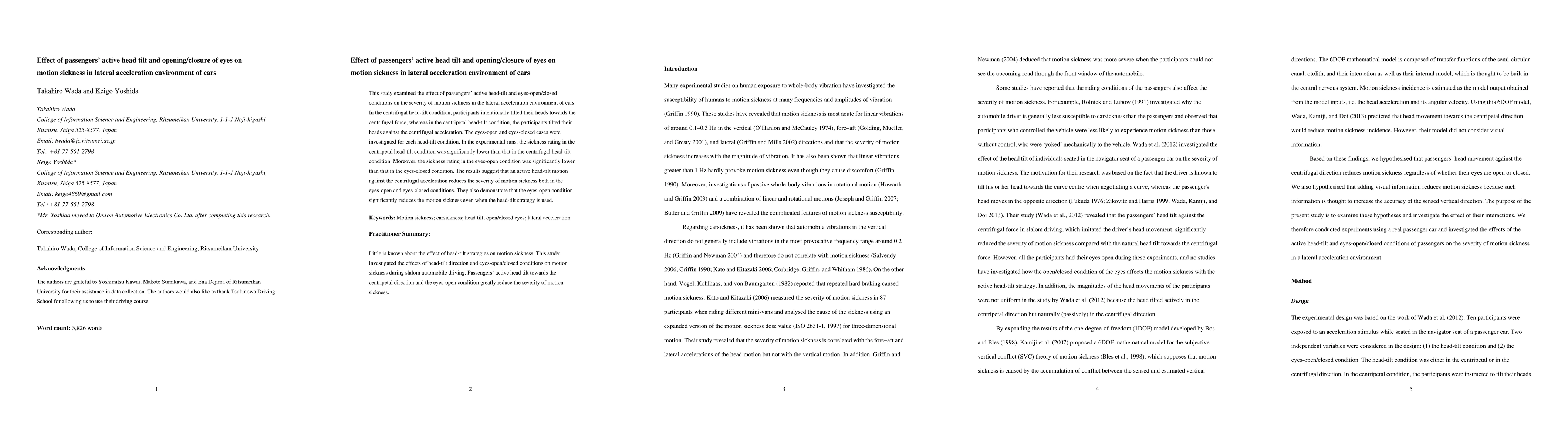 This study examined the effect of passengers' active head-tilt (centripetal vs centrifugal) and eyes-open/closed conditions on motion sickness in a lateral acceleration environment, using slalom driving simulations with 16 participants.