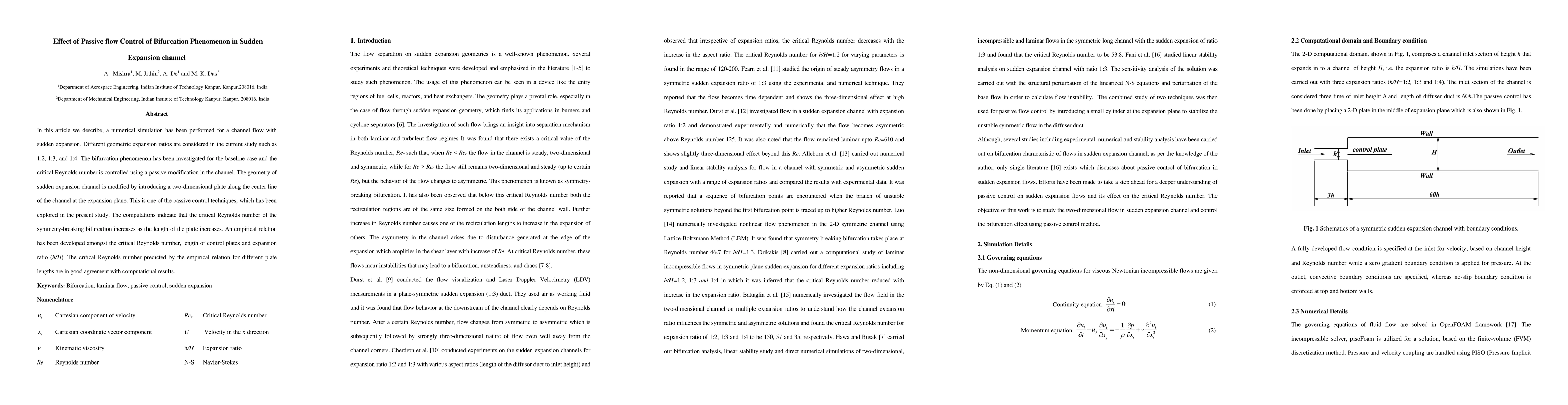 In this article we describe, a numerical simulation has been performed for a channel flow with sudden expansion. Different geometric expansion ratios are considered in the current study such as 1:2, 1:3, and 1:4. The bifurcation phenomenon has been investigated for the baseline case and the critical Reynolds number is controlled using a passive modification in the channel. The geometry of sudden expansion channel is modified by introducing a two-dimensional plate along the center line of the channel at the expansion plane. This is one of the passive control techniques, which has been explored in the present study. The computations indicate that the critical Reynolds number of the symmetry-breaking bifurcation increases as the length of the plate increases. An empirical relation has been developed amongst the critical Reynolds number, length of control plates and expansion ratio (h/H). The critical Reynolds number predicted by the empirical relation for different plate lengths are in good agreement with computational results.