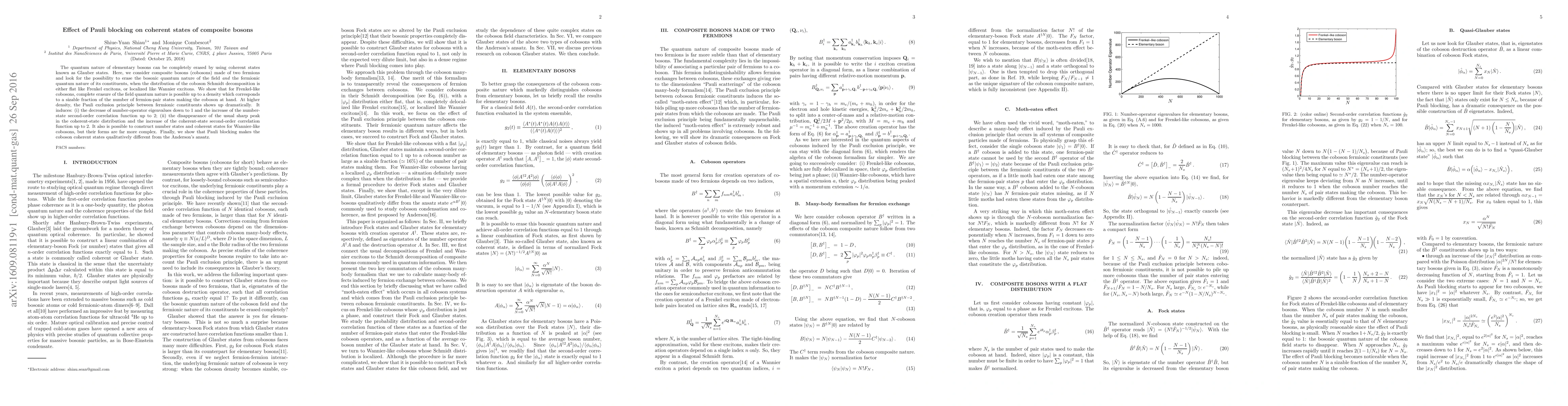 The quantum nature of elementary bosons can be completely erased by using coherent states known as Glauber states. Here, we consider composite bosons (cobosons) made of two fermions and look for the possibility to erase the bosonic quantum nature of the field and the fermionic quantum nature of its constituents, when the distribution of the coboson Schmidt decomposition is either flat like Frenkel excitons, or localized like Wannier excitons. We show that for Frenkel-like cobosons, complete erasure of the field quantum nature is possible up to a density which corresponds to a sizable fraction of the number of fermion-pair states making the coboson at hand. At higher density, the Pauli exclusion principle between fermionic constituents shows up dramatically. It induces: (i) the decrease of number-operator eigenvalues down to 1 and the increase of the number-state second-order correlation function up to 2; (ii) the disappearance of the usual sharp peak in the coherent-state distribution and the increase of the coherent-state second-order correlation function up to 2. It also is possible to construct number states and coherent states for Wannier-like cobosons, but their forms are far more complex. Finally, we show that Pauli blocking makes the coboson coherent states qualitatively different from the Anderson's ansatz.