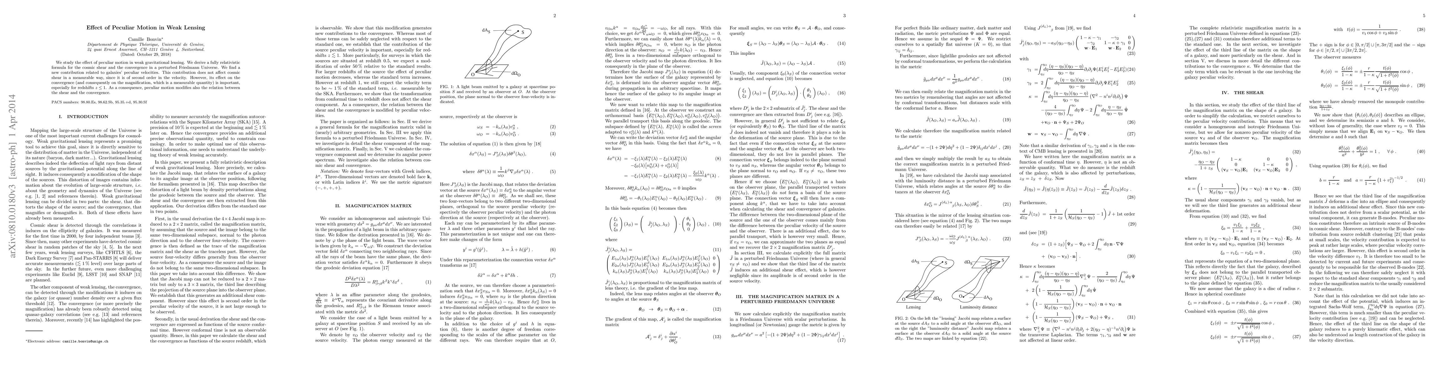 We study the effect of peculiar motion in weak gravitational lensing. We derive a fully relativistic formula for the cosmic shear and the convergence in a perturbed Friedmann Universe. We find a new contribution related to galaxies peculiar velocity. This contribution does not affect cosmic shear in a measurable way, since it is of second order in the velocity. However, its effect on the convergence (and consequently on the magnification, which is a measurable quantity) is important, especially for redshifts z < 1. As a consequence, peculiar motion modifies also the relation between the shear and the convergence.