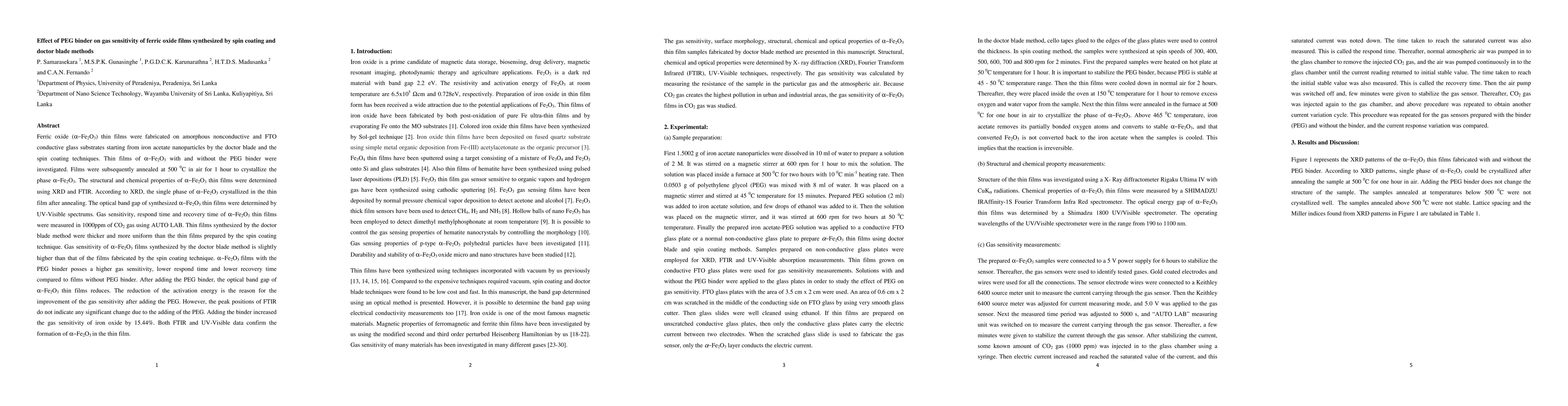 This paper investigates the effect of PEG binder on the gas sensitivity of ferric oxide (Fe2O3) thin films synthesized by doctor blade and spin coating methods. Fe2O3 films with PEG binder show higher gas sensitivity, lower response time, and lower recovery time compared to films without binder, attributed to a reduced optical band gap and activation energy.