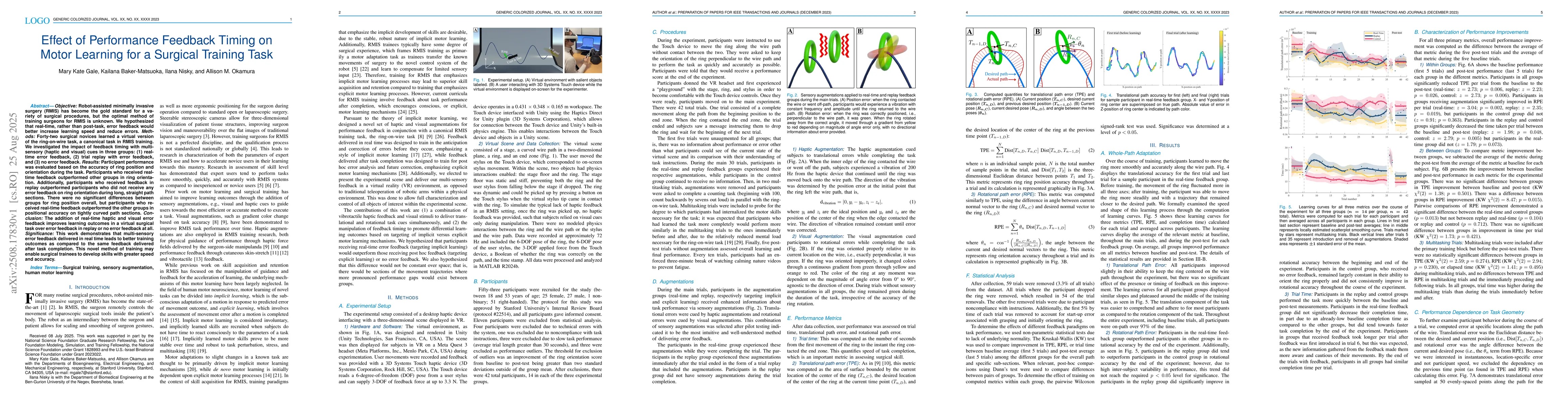 Objective: Robot-assisted minimally invasive surgery (RMIS) has become the gold standard for a variety of surgical procedures, but the optimal method of training surgeons for RMIS is unknown. We hypothesized that real-time, rather than post-task, error feedback would better increase learning speed and reduce errors. Methods: Forty-two surgical novices learned a virtual version of the ring-on-wire task, a canonical task in RMIS training. We investigated the impact of feedback timing with multi-sensory (haptic and visual) cues in three groups: (1) real-time error feedback, (2) trial replay with error feedback, and (3) no error feedback. Results: Participant performance was evaluated based on the accuracy of ring position and orientation during the task. Participants who received real-time feedback outperformed other groups in ring orientation. Additionally, participants who received feedback in replay outperformed participants who did not receive any error feedback on ring orientation during long, straight path sections. There were no significant differences between groups for ring position overall, but participants who received real-time feedback outperformed the other groups in positional accuracy on tightly curved path sections. Conclusion: The addition of real-time haptic and visual error feedback improves learning outcomes in a virtual surgical task over error feedback in replay or no error feedback at all. Significance: This work demonstrates that multi-sensory error feedback delivered in real time leads to better training outcomes as compared to the same feedback delivered after task completion. This novel method of training may enable surgical trainees to develop skills with greater speed and accuracy.