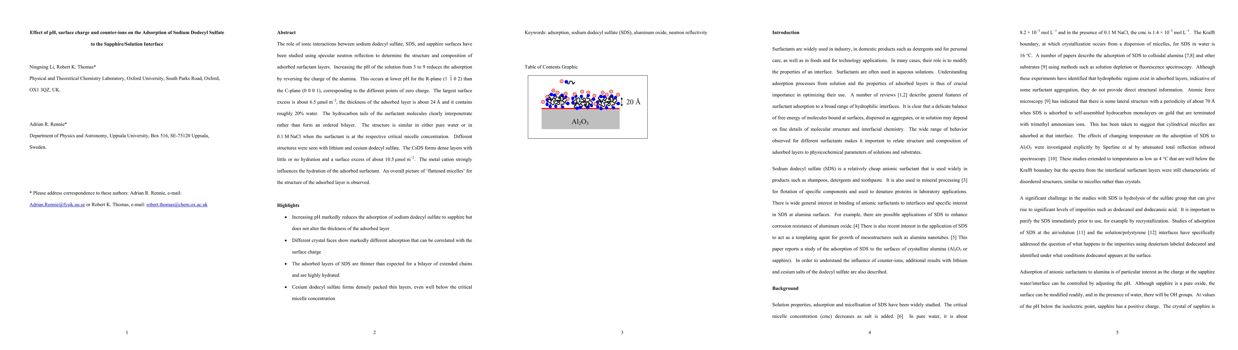 This study investigates the adsorption of sodium dodecyl sulfate (SDS) on sapphire surfaces, revealing that pH and counter-ions significantly affect the structure and composition of the adsorbed surfactant layers. The adsorption decreases with increasing pH, particularly affecting the R-plane more than the C-plane due to differing points of zero charge.