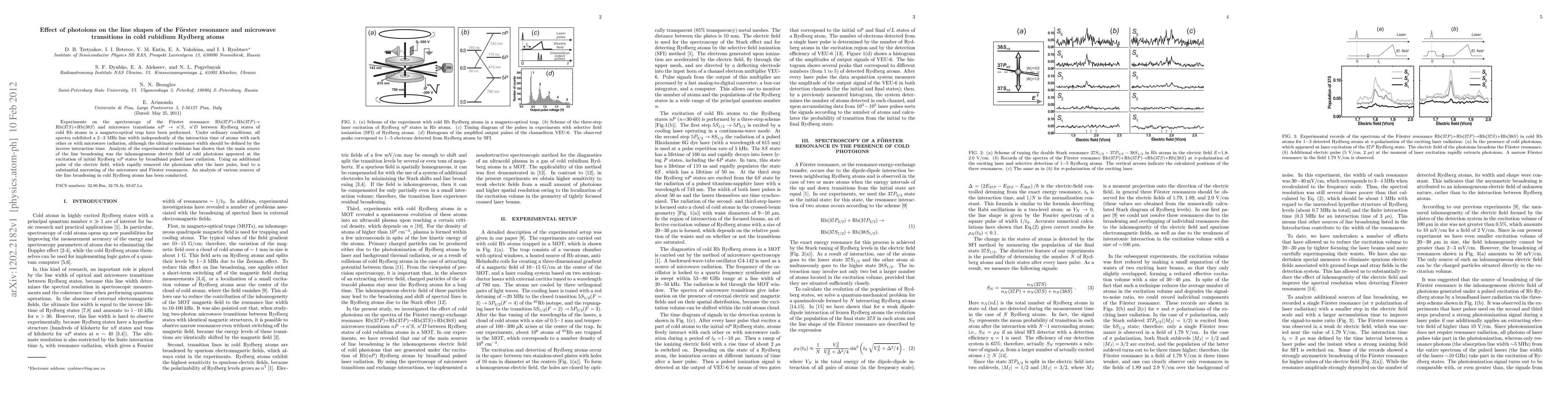 This paper investigates the impact of photoions on the line shapes of F\"orster resonance and microwave transitions in cold rubidium Rydberg atoms, finding that photoions cause significant line broadening. Applying an additional electric field pulse to remove photoions led to a notable narrowing of the spectral lines.