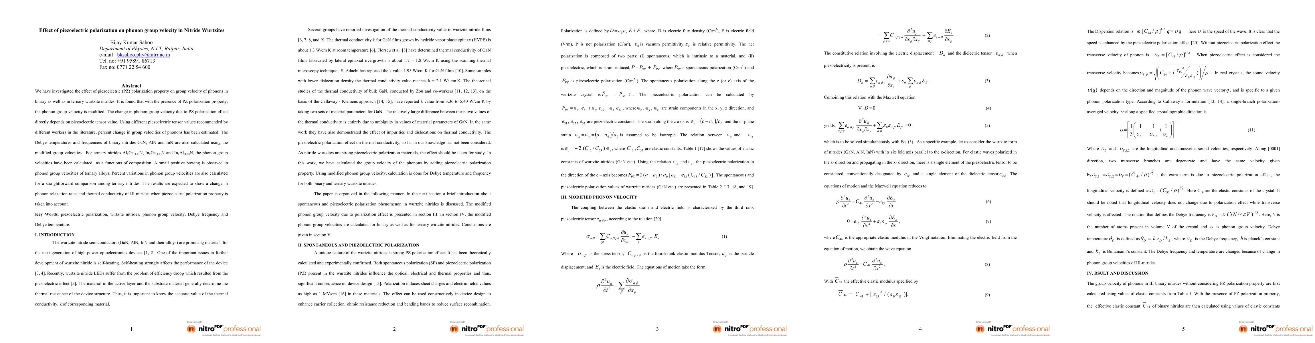 This study investigates how piezoelectric polarization affects phonon group velocity in wurtzite nitrides, finding that it modifies the velocity depending on the piezoelectric tensor value. The research calculates Debye temperatures and frequencies for binary nitrides and phonon group velocities for ternary nitrides as functions of composition, revealing small positive bowing and expected changes in phonon relaxation rates and thermal conductivity.