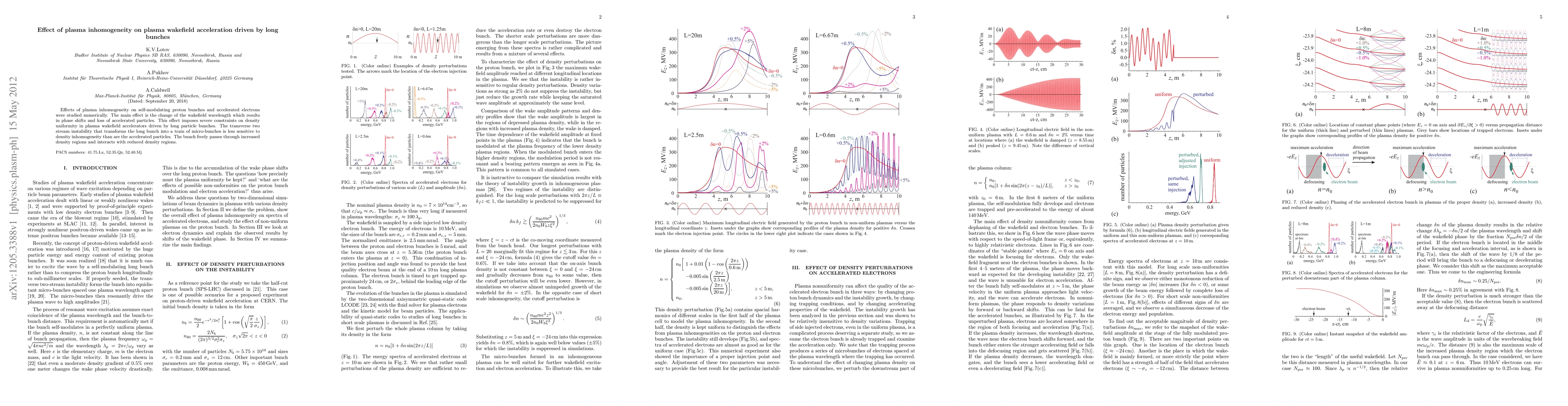 Effects of plasma inhomogeneity on self-modulating proton bunches and accelerated electrons were studied numerically. The main effect is the change of the wakefield wavelength which results in phase shifts and loss of accelerated particles. This effect imposes severe constraints on density uniformity in plasma wakefield accelerators driven by long particle bunches. The transverse two stream instability that transforms the long bunch into a train of micro-bunches is less sensitive to density inhomogeneity than are the accelerated particles. The bunch freely passes through increased density regions and interacts with reduced density regions.