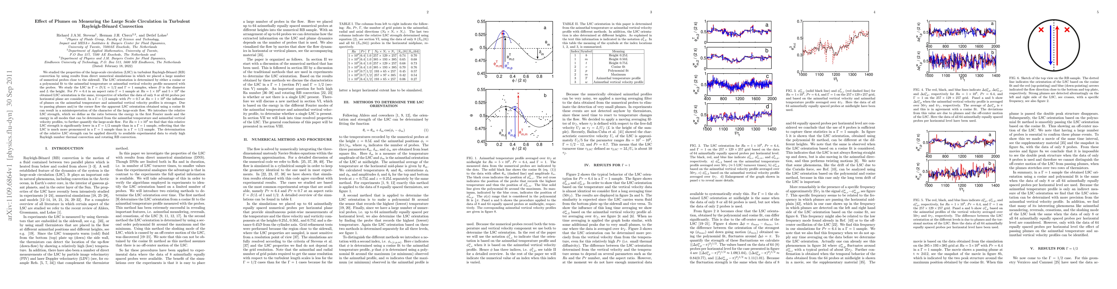 This paper investigates the impact of plumes on measuring large-scale circulation (LSC) in turbulent Rayleigh-Bénard convection through direct numerical simulations. It finds that plumes can distort LSC orientation measurements, especially in samples with a lower aspect ratio, and introduces the relative LSC strength to better quantify the large-scale flow.