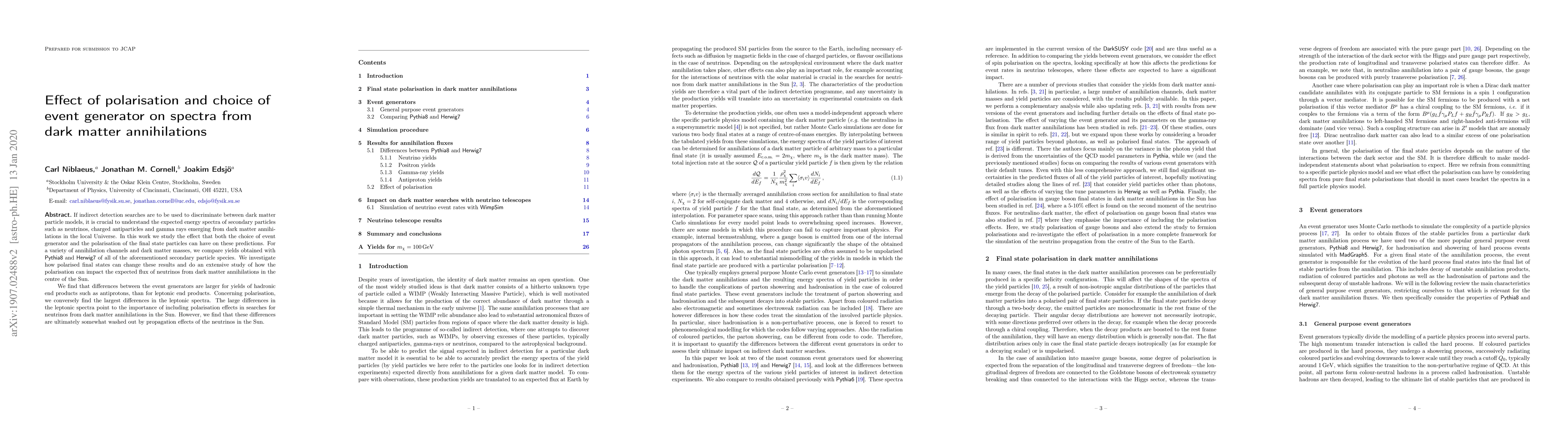 If indirect detection searches are to be used to discriminate between dark matter particle models, it is crucial to understand the expected energy spectra of secondary particles such as neutrinos, charged antiparticles and gamma-rays emerging from dark matter annihilations in the local Universe. In this work we study the effect that both the choice of event generator and the polarisation of the final state particles can have on these predictions. For a variety of annihilation channels and dark matter masses, we compare yields obtained with Pythia8 and Herwig7 of all of the aforementioned secondary particle species. We investigate how polarised final states can change these results and do an extensive study of how the polarisation can impact the expected flux of neutrinos from dark matter annihilations in the centre of the Sun. We find that differences between the event generators are larger for yields of hadronic end products such as antiprotons, than for leptonic end products. Concerning polarisation, we conversely find the largest differences in the leptonic spectra. The large differences in the leptonic spectra point to the importance of including polarisation effects in searches for neutrinos from dark matter annihilations in the Sun. However, we find that these differences are ultimately somewhat washed out by propagation effects of the neutrinos in the Sun.
