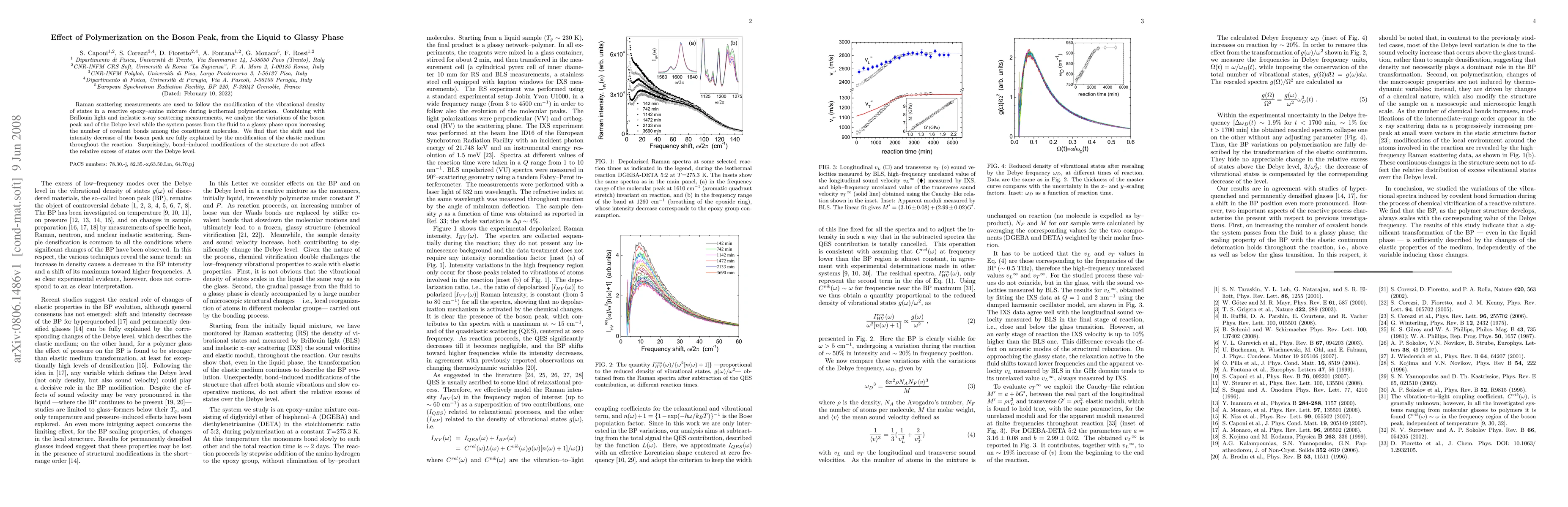 Raman scattering measurements are used to follow the modification of the vibrational density of states in a reactive epoxy{amine mixture during isothermal polymerization. Combining with Brillouin light and inelastic x-ray scattering measurements, we analyze the variations of the boson peak and of the Debye level while the system passes from the uid to a glassy phase upon increasing the number of covalent bonds among the constituent molecules. We find that the shift and the intensity decrease of the boson peak are fully explained by the modification of the elastic medium throughout the reaction. Surprisingly, bond-induced modifications of the structure do not affect the relative excess of states over the Debye level.