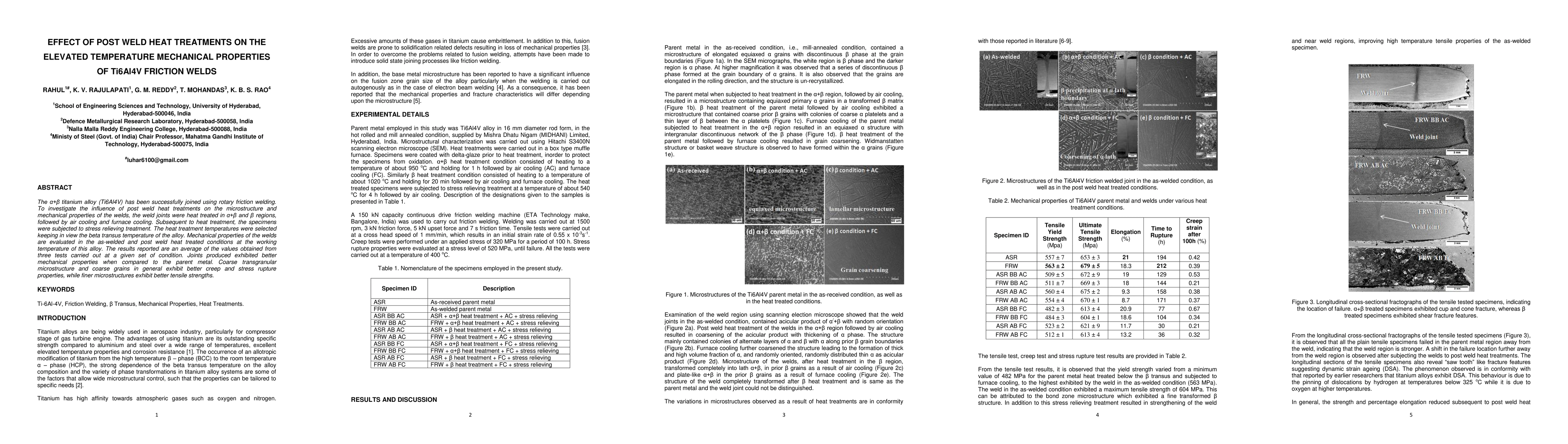 This study investigates the impact of post weld heat treatments on the elevated temperature mechanical properties of Ti6Al4V friction welds. Heat treatments in α+β and β regions followed by stress relieving resulted in improved mechanical properties, with coarse microstructures showing better creep and stress rupture properties.