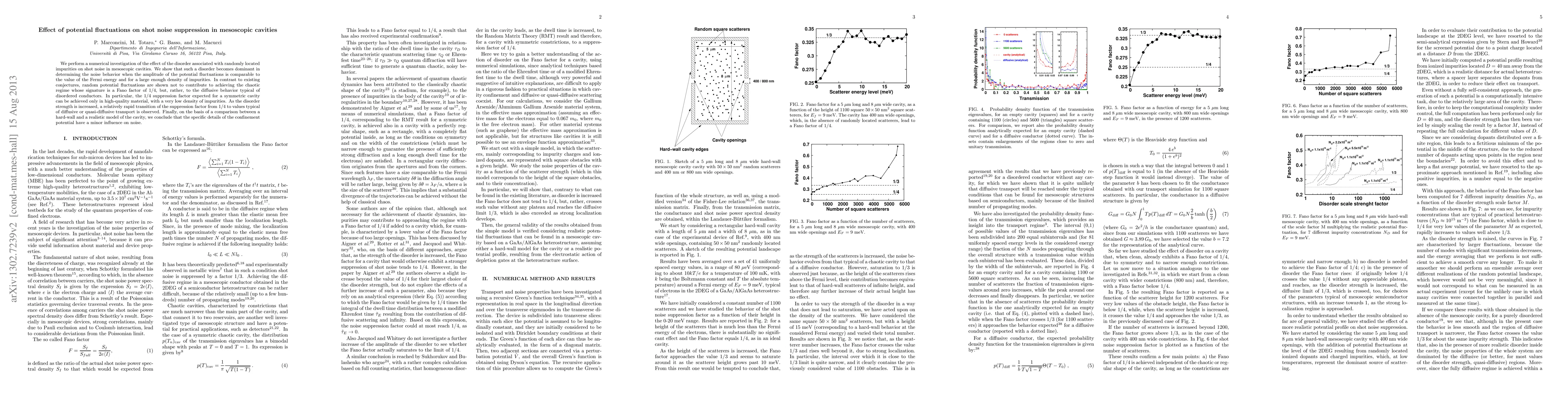 We perform a numerical investigation of the effect of the disorder associated with randomly located impurities on shot noise in mesoscopic cavities. We show that such a disorder becomes dominant in determining the noise behavior when the amplitude of the potential fluctuations is comparable to the value of the Fermi energy and for a large enough density of impurities. In contrast to existing conjectures, random potential fluctuations are shown not to contribute to achieving the chaotic regime whose signature is a Fano factor of 1/4, but, rather, to the diffusive behavior typical of disordered conductors. In particular, the 1/4 suppression factor expected for a symmetric cavity can be achieved only in high-quality material, with a very low density of impurities. As the disorder strength is increased, a relatively rapid transition of the suppression factor from 1/4 to values typical of diffusive or quasi-diffusive transport is observed. Finally, on the basis of a comparison between a hard-wall and a realistic model of the cavity, we conclude that the specific details of the confinement potential have a minor influence on noise.