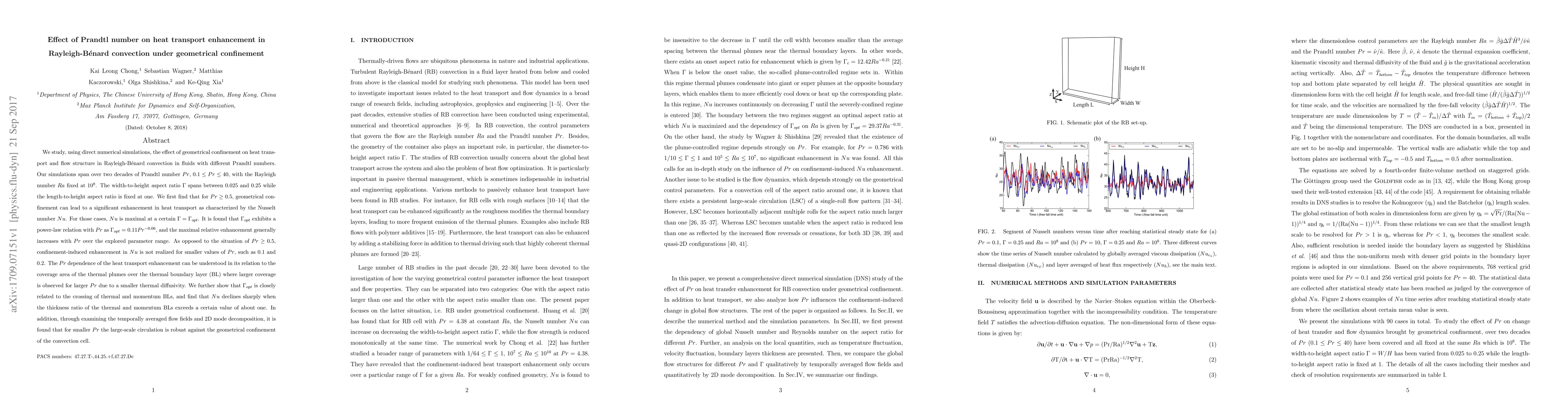 We study, using direct numerical simulations, the effect of geometrical confinement on heat transport and flow structure in Rayleigh-B\'enard convection in fluids with different Prandtl numbers. Our simulations span over two decades of Prandtl number $Pr$, $0.1 \leq Pr \leq 40$, with the Rayleigh number $Ra$ fixed at $10^8$. The width-to-height aspect ratio $\Gamma$ spans between $0.025$ and $0.25$ while the length-to-height aspect ratio is fixed at one. We first find that for $Pr \geq 0.5$, geometrical confinement can lead to a significant enhancement in heat transport as characterized by the Nusselt number $Nu$. For those cases, $Nu$ is maximal at a certain $\Gamma = \Gamma_{opt}$. It is found that $\Gamma_{opt}$ exhibits a power-law relation with $Pr$ as $\Gamma_{opt}=0.11Pr^{-0.06}$, and the maximal relative enhancement generally increases with $Pr$ over the explored parameter range. As opposed to the situation of $Pr \geq 0.5$, confinement-induced enhancement in $Nu$ is not realized for smaller values of $Pr$, such as $0.1$ and $0.2$. The $Pr$ dependence of the heat transport enhancement can be understood in its relation to the coverage area of the thermal plumes over the thermal boundary layer (BL) where larger coverage is observed for larger $Pr$ due to a smaller thermal diffusivity. We further show that $\Gamma_{opt}$ is closely related to the crossing of thermal and momentum BLs, and find that $Nu$ declines sharply when the thickness ratio of the thermal and momentum BLs exceeds a certain value of about one. In addition, through examining the temporally averaged flow fields and 2D mode decomposition, it is found that for smaller $Pr$ the large-scale circulation is robust against the geometrical confinement of the convection cell.