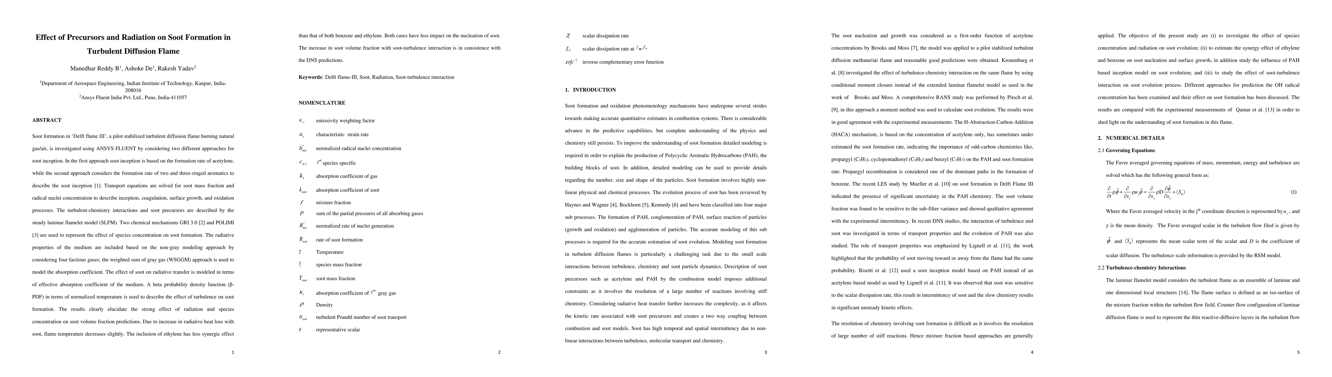 This paper investigates soot formation in a turbulent diffusion flame using ANSYS FLUENT, comparing two soot inception approaches based on acetylene and aromatics. It highlights the significant influence of radiation and species concentration on soot volume fraction, with a slight decrease in flame temperature due to increased radiative heat loss.