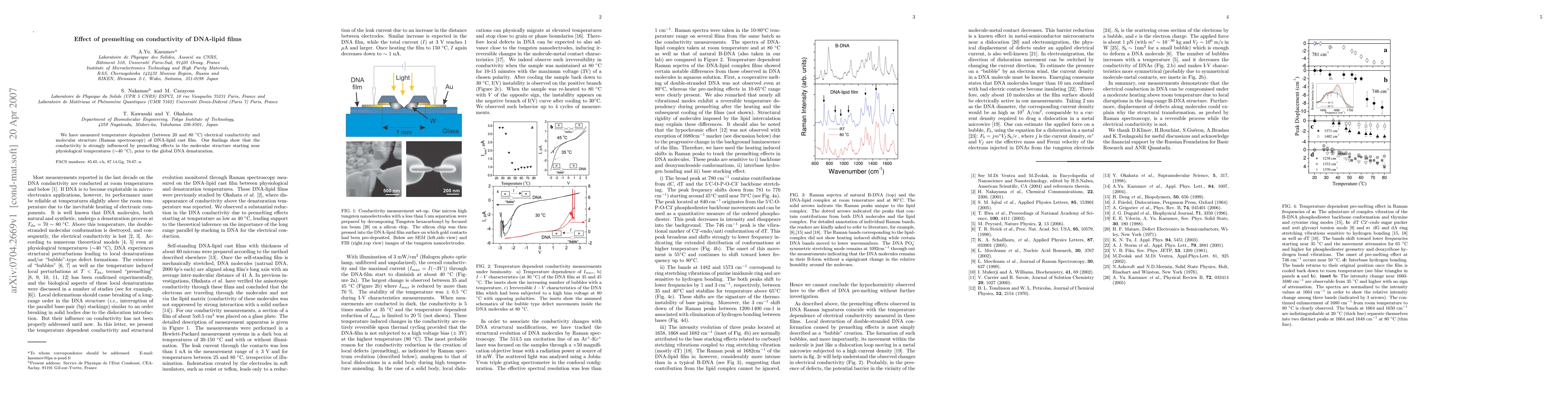 We have measured temperature dependent (between 20 and 80 C) electrical conductivity and molecular structure (Raman spectroscopy) of DNA-lipid cast film. Our findings show that the conductivity is strongly influenced by premelting effects in the molecular structure starting near physiological temperatures (~40 C), prior to the global DNA denaturation.